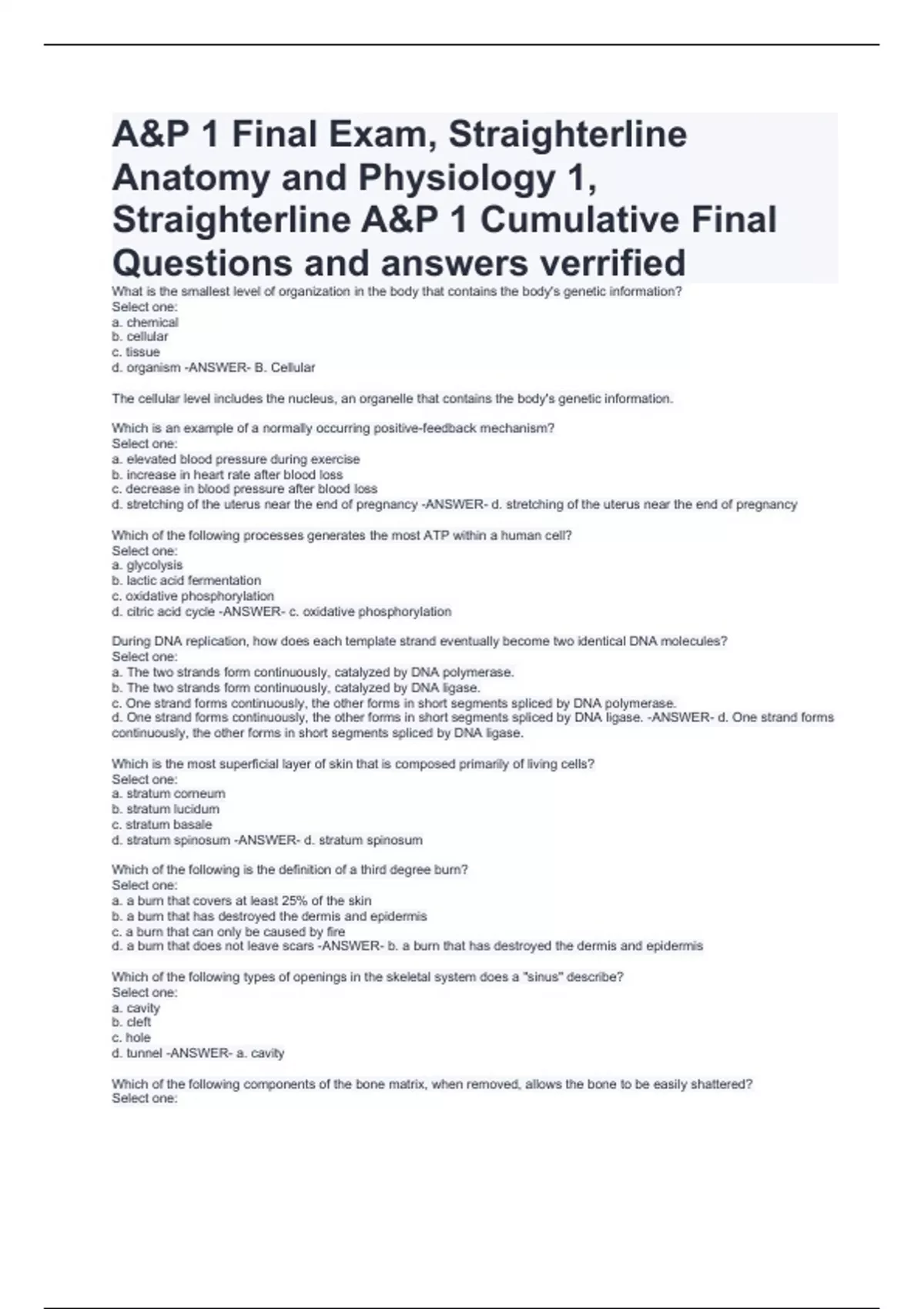 A&P 1 Final Exam, Straighterline Anatomy and Physiology 1, Straighterline A&P 1 Cumulative Final Questions and answers verrified What is the smallest level of organization in the body that contains the body's genetic information? Select one: a. chemical b. cellular c. tissue d. organism -ANSWER- B. Cellular The cellular level includes the nucleus, an organelle that contains the body's genetic information. Which is an example of a normally occurring positive-feedback mechanism? Select one: a. elevated blood pressure during exercise b. increase in heart rate after blood loss c. decrease in blood pressure after blood loss d. stretching of the uterus near the end of pregnancy -ANSWER- d. stretching of the uterus near the end of pregnancy Which of the following processes generates the most ATP within a human cell? Select one: a. glycolysis b. lactic acid fermentation c. oxidative phosphorylation d. citric acid cycle -ANSWER- c. oxidative phosphorylation During DNA replication, how does each template strand eventually become two identical DNA molecules? Select one: a. The two strands form continuously, catalyzed by DNA polymerase. b. The two strands form continuously, catalyzed by DNA ligase. c. One strand forms continuously, the other forms in short segments spliced by DNA polymerase. d. One strand forms continuously, the other forms in short segments spliced by DNA ligase. -ANSWER- d. One strand forms continuously, the other forms in short segments spliced by DNA ligase. Which is the most superficial layer of skin that is composed primarily of living cells? Select one: a. stratum corneum b. stratum lucidum c. stratum basale d. stratum spinosum -ANSWER- d. stratum spinosum Which of the following is the definition of a third degree burn? Select one: a. a burn that covers at least 25% of the skin b. a burn that has destroyed the dermis and epidermis c. a burn that can only be caused by fire d. a burn that does not leave scars -ANSWER- b. a burn that has destroyed the dermis and epidermis Which of the following types of openings in the skeletal system does a "sinus" describe? Select one: a. cavity b. cleft c. hole d. tunnel -ANSWER- a. cavity Which of the following components of the bone matrix, when removed, allows the bone to be easily shattered? Select one: a