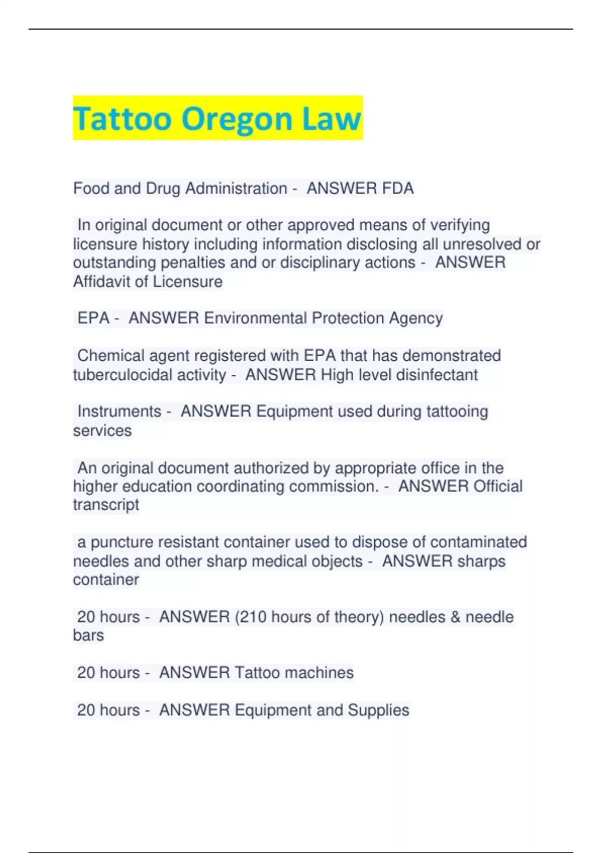 Tattoo Oregon Law Food and Drug Administration - ANSWER FDA In original document or other approved means of verifying licensure history including information disclosing all unresolved or outstanding penalties and or disciplinary actions - ANSWER Affidavit of Licensure EPA - ANSWER Environmental Protection Agency Chemical agent registered with EPA that has demonstrated tuberculocidal activity - ANSWER High level disinfectant Instruments - ANSWER Equipment used during tattooing services An original document authorized by appropriate office in the higher education coordinating commission. - ANSWER Official transcript a puncture resistant container used to dispose of contaminated needles and other sharp medical objects - ANSWER sharps container 20 hours - ANSWER (210 hours of theory) needles & needle bars 20 hours - ANSWER Tattoo machines 20 hours - ANSWER Equipment and Supplies 40 hours - ANSWER safety and infection control 10 hours - ANSWER Colors theory & pigment, design art & placement 20 hours - ANSWER Skin & Diseases 20 hours - ANSWER Client Services 20 hours - ANSWER Business Operations 20 hours - ANSWER Oregon law 10 hours - ANSWER Discretionary 10 hours (you may accrue and roll over 8 hours into the next year) - ANSWER Continuing Education Ink, dyes, pigments - ANSWER Must be purchased from a commercial supplier. They must have an expiration date. Tattooing services performed on person under 18 ONLY WHEN - ANSWER Authorized or prescribed by a doctor (physicians statement) fish and reptiles - ANSWER Are allowed in facility as long as they're in aquariums/terrariums