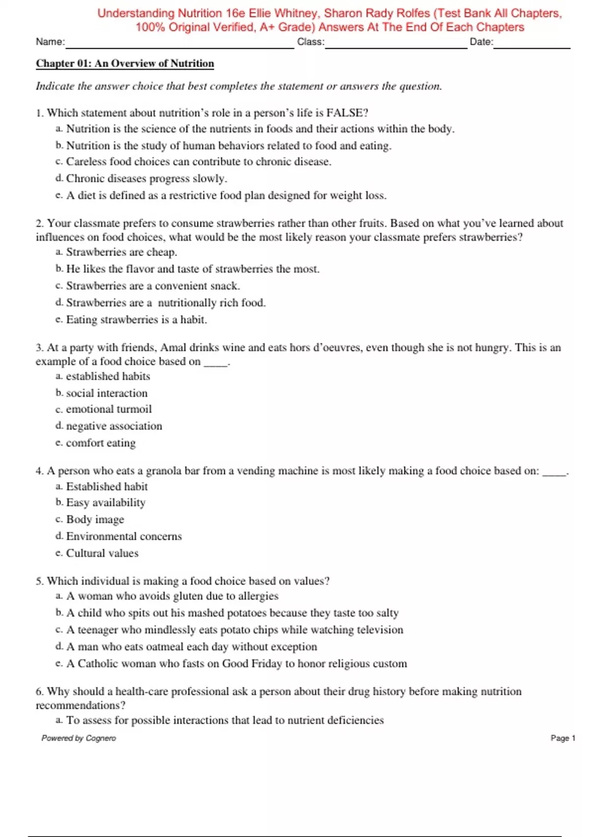 Test Bank For Understanding Nutrition 16th Edition By Ellie Whitney, Sharon Rady Rolfes (All Chapters, 100% Original Verified, A+ Grade)