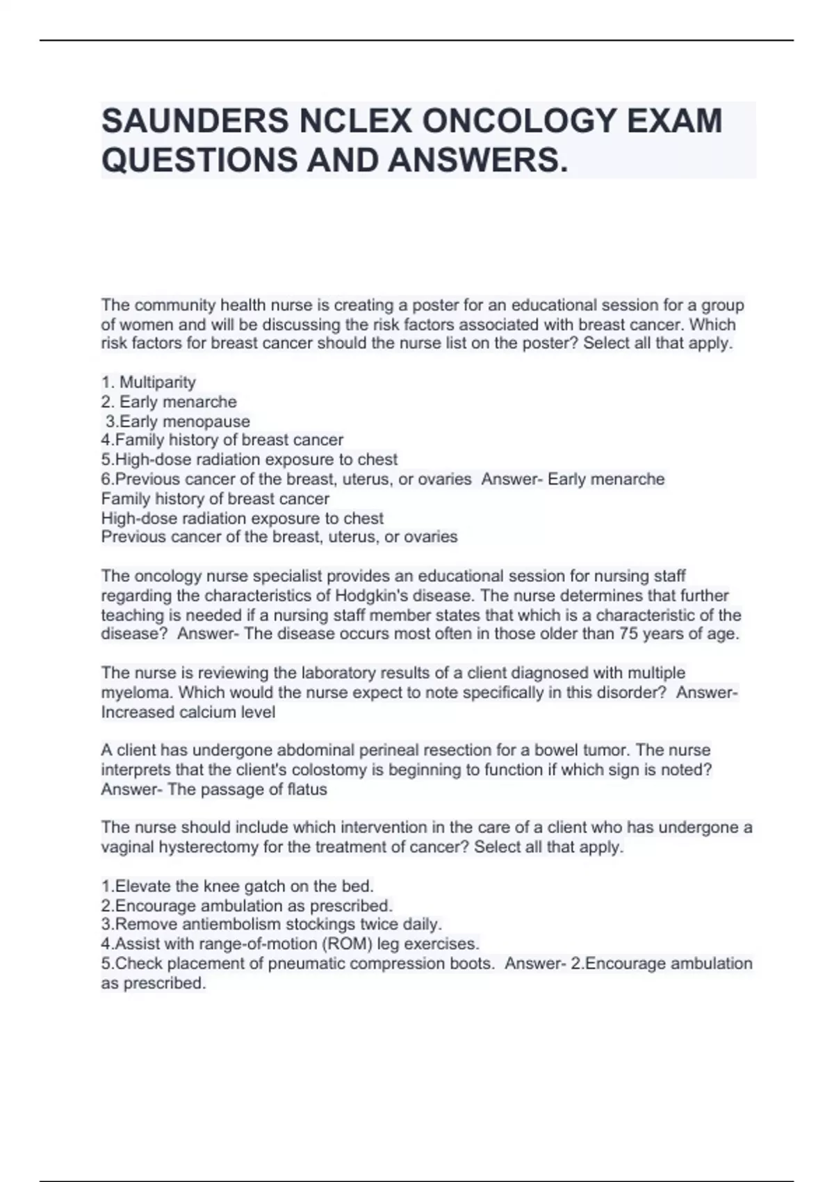 SAUNDERS NCLEX ONCOLOGY EXAM QUESTIONS AND ANSWERS