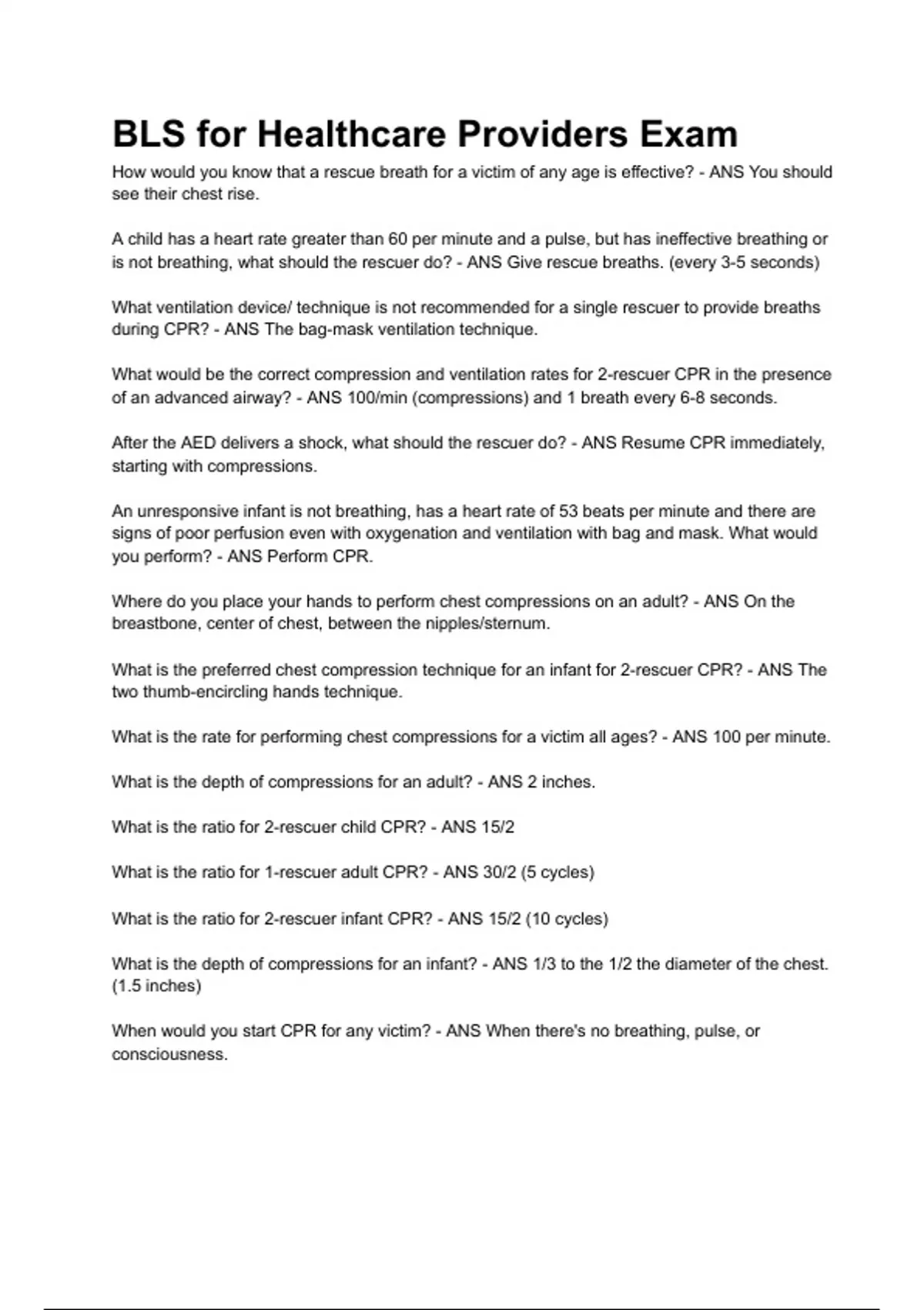 BLS for Healthcare Providers Exam How would you know that a rescue breath for a victim of any age is effective? - ANS You should see their chest rise. A child has a heart rate greater than 60 per minute and a pulse, but has ineffective breathing or is not breathing, what should the rescuer do? - ANS Give rescue breaths. (every 3-5 seconds) What ventilation device/ technique is not recommended for a single rescuer to provide breaths during CPR? - ANS The bag-mask ventilation technique. What would be the correct compression and ventilation rates for 2-rescuer CPR in the presence of an advanced airway? - ANS 100/min (compressions) and 1 breath every 6-8 seconds.