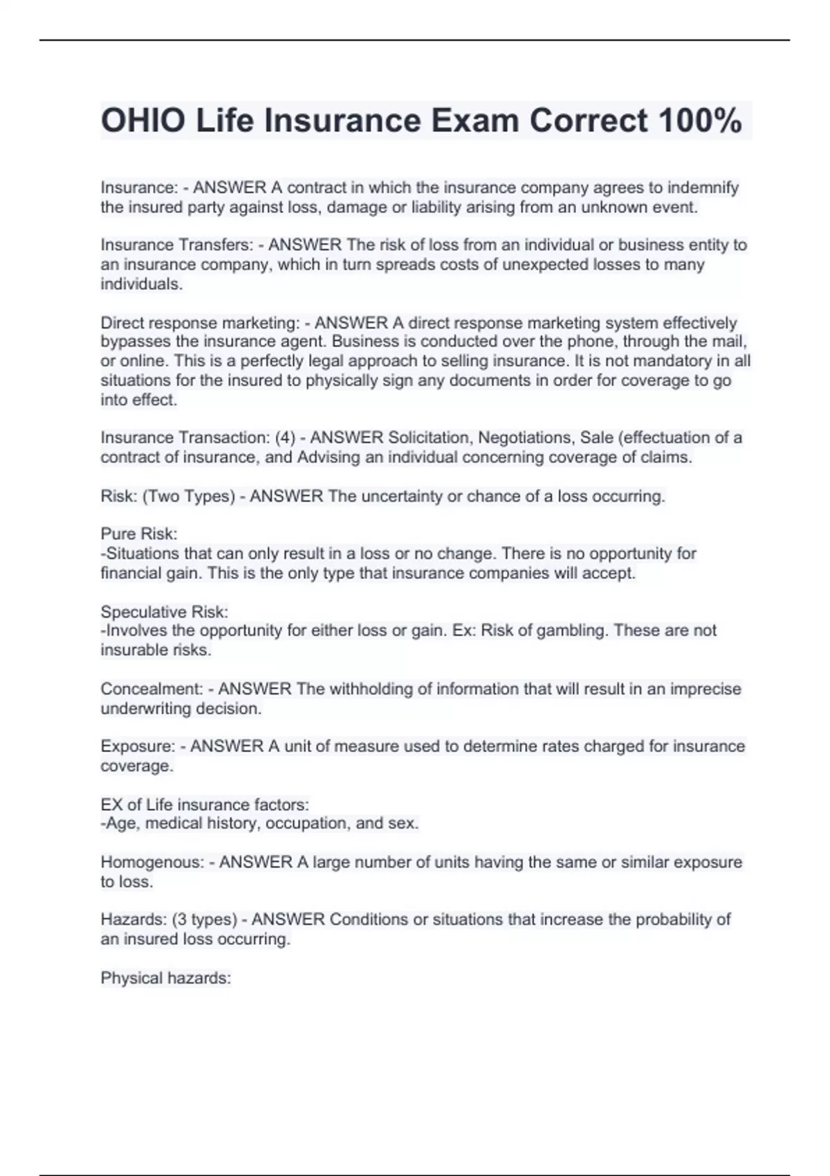 Insurance: - ANSWER A contract in which the insurance company agrees to indemnify the insured party against loss, damage or liability arising from an unknown event. Insurance Transfers: - ANSWER The risk of loss from an individual or business entity to an insurance company, which in turn spreads costs of unexpected losses to many individuals. Direct response marketing: - ANSWER A direct response marketing system effectively bypasses the insurance agent. Business is conducted over the phone, through the mail, or online. This is a perfectly legal approach to selling insurance. It is not mandatory in all situations for the insured to physically sign any documents in order for coverage to go into effect. Insurance Transaction: (4) - ANSWER Solicitation, Negotiations, Sale (effectuation of a contract of insurance, and Advising an individual concerning coverage of claims. Risk: (Two Types) - ANSWER The uncertainty or chance of a loss occurring. Pure Risk: -Situations that can only result in a loss or no change. There is no opportunity for financial gain. This is the only type that insurance companies will accept. Speculative Risk: -Involves the opportunity for either loss or gain. Ex: Risk of gambling. These are not insurable risks. Concealment: - ANSWER The withholding of information that will result in an imprecise underwriting decision. Exposure: - ANSWER A unit of measure used to determine rates charged for insurance coverage. EX of Life insurance factors: