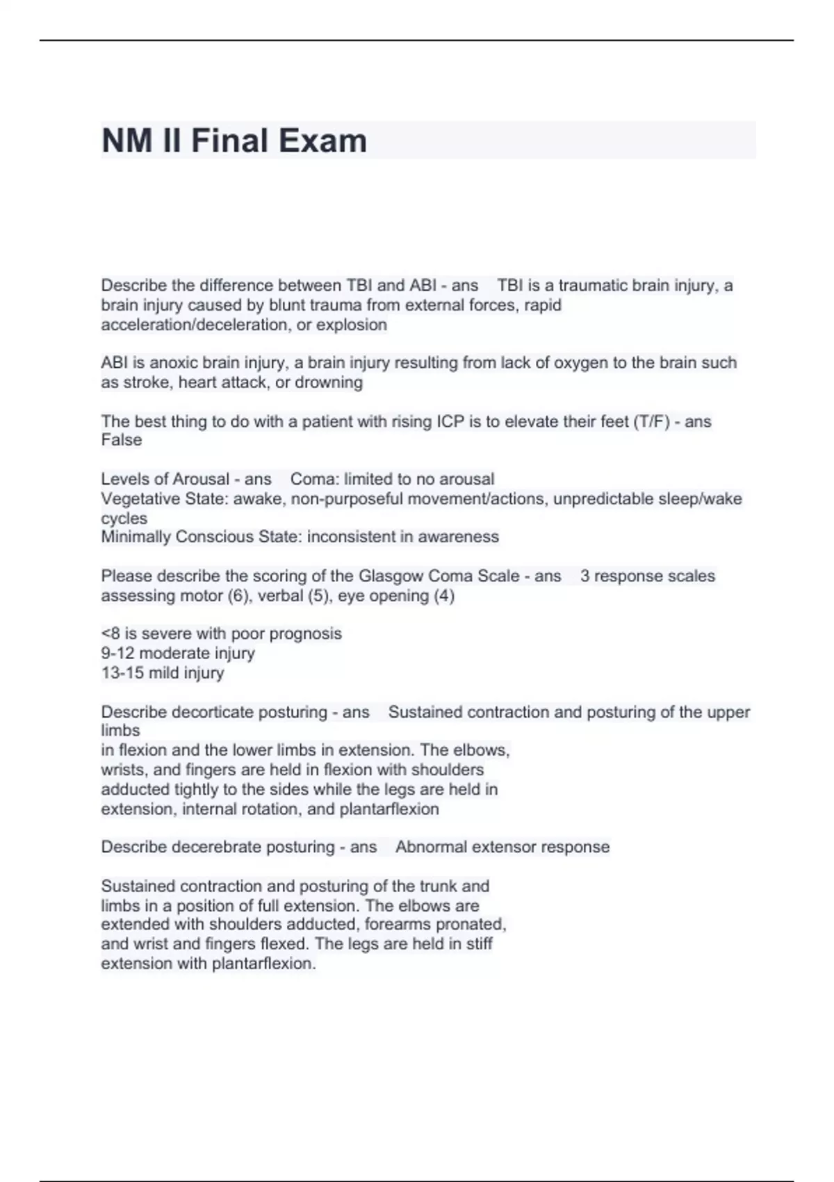 Describe the difference between TBI and ABI - ans TBI is a traumatic brain injury, a brain injury caused by blunt trauma from external forces, rapid acceleration/deceleration, or explosion ABI is anoxic brain injury, a brain injury resulting from lack of oxygen to the brain such as stroke, heart attack, or drowning The best thing to do with a patient with rising ICP is to elevate their feet (T/F) - ans False Levels of Arousal - ans Coma: limited to no arousal Vegetative State: awake, non-purposeful movement/actions, unpredictable sleep/wake cycles Minimally Conscious State: inconsistent in awareness Please describe the scoring of the Glasgow Coma Scale - ans 3 response scales assessing motor (6), verbal (5), eye opening (4) <8 is severe with poor prognosis 9-12 moderate injury 13-15 mild injury Describe decorticate posturing - ans Sustained contraction and posturing of the upper limbs in flexion and the lower limbs in extension. The elbows, wrists, and fingers are held in flexion with shoulders adducted tightly to the sides while the legs are held in extension, internal rotation, and plantarflexion Describe decerebrate posturing - ans Abnormal extensor response Sustained contraction and posturing of the trunk and limbs in a position of full extension. The elbows are extended with shoulders adducted, forearms pronated, and wrist and fingers flexed. The legs are held in stiff extension with plantarflexion.