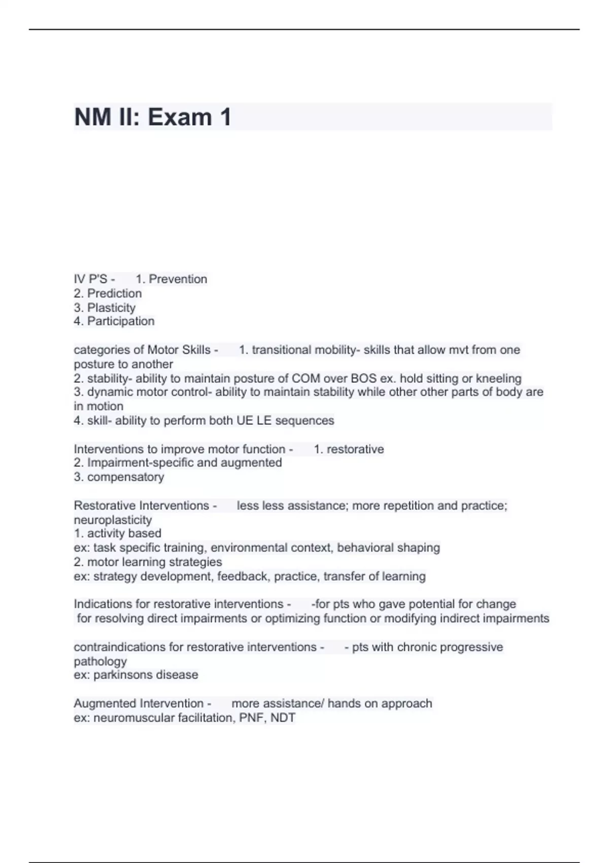 IV P'S - 1. Prevention 2. Prediction 3. Plasticity 4. Participation categories of Motor Skills - 1. transitional mobility- skills that allow mvt from one posture to another 2. stability- ability to maintain posture of COM over BOS ex. hold sitting or kneeling 3. dynamic motor control- ability to maintain stability while other other parts of body are in motion 4. skill- ability to perform both UE LE sequences Interventions to improve motor function - 1. restorative 2. Impairment-specific and augmented 3. compensatory Restorative Interventions - less less assistance; more repetition and practice; neuroplasticity 1. activity based ex: task specific training, environmental context, behavioral shaping 2. motor learning strategies ex: strategy development, feedback, practice, transfer of learning Indications for restorative interventions - -for pts who gave potential for change for resolving direct impairments or optimizing function or modifying indirect impairments contraindications for restorative interventions - - pts with chronic progressive pathology ex: parkinsons disease Augmented Intervention - more assistance/ hands on approach ex: neuromuscular facilitation, PNF, NDT
