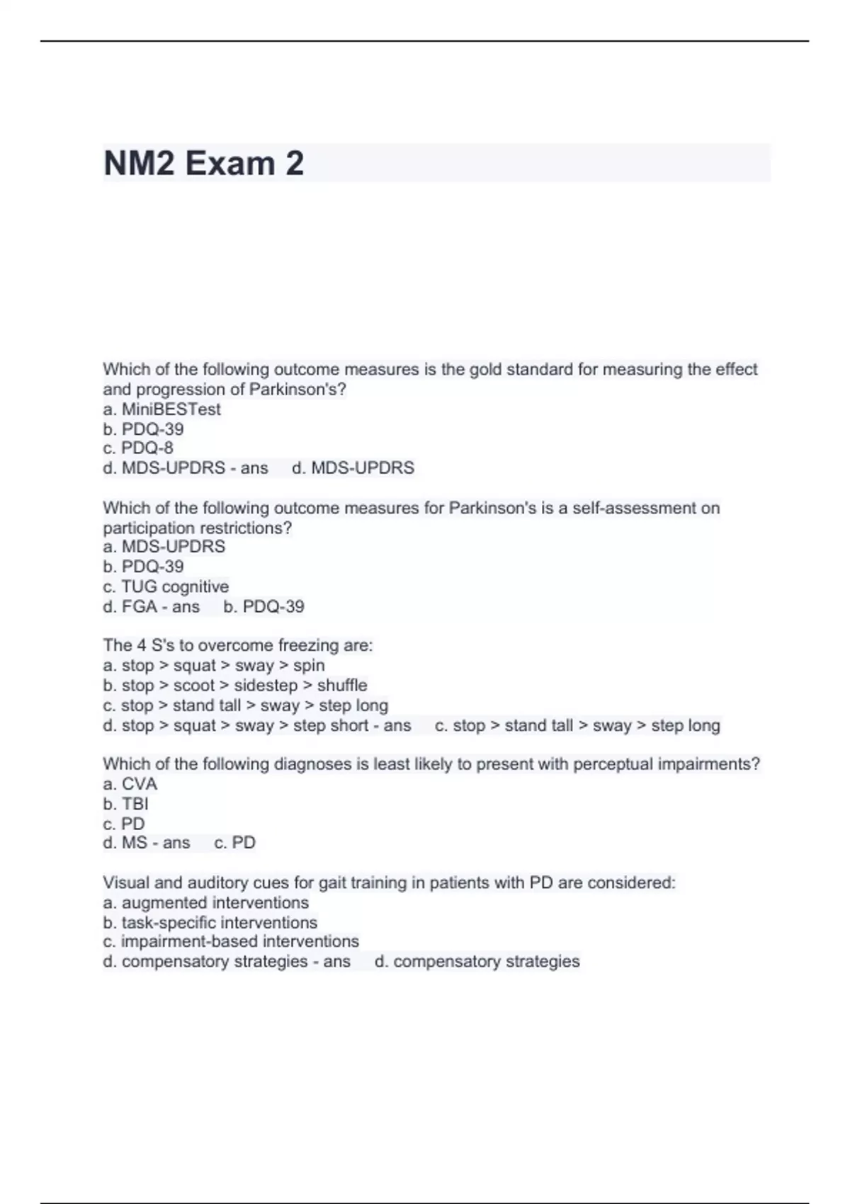 Which of the following outcome measures is the gold standard for measuring the effect and progression of Parkinson's? a. MiniBESTest b. PDQ-39 c. PDQ-8 d. MDS-UPDRS - ans d. MDS-UPDRS Which of the following outcome measures for Parkinson's is a self-assessment on participation restrictions? a. MDS-UPDRS b. PDQ-39 c. TUG cognitive d. FGA - ans b. PDQ-39 The 4 S's to overcome freezing are: a. stop > squat > sway > spin b. stop > scoot > sidestep > shuffle c. stop > stand tall > sway > step long d. stop > squat > sway > step short - ans c. stop > stand tall > sway > step long Which of the following diagnoses is least likely to present with perceptual impairments? a. CVA b. TBI c. PD d. MS - ans c. PD Visual and auditory cues for gait training in patients with PD are considered: a. augmented interventions b. task-specific interventions c. impairment-based interventions d. compensatory strategies - ans d. compensatory strategies