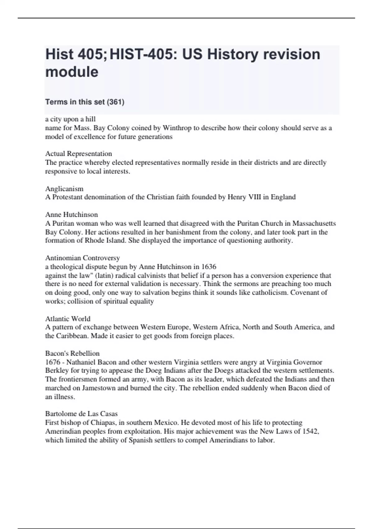 HIST-405: US History revision module Terms in this set (361) a city upon a hill name for Mass. Bay Colony coined by Winthrop to describe how their colony should serve as a model of excellence for future generations Actual Representation The practice whereby elected representatives normally reside in their districts and are directly responsive to local interests. Anglicanism A Protestant denomination of the Christian faith founded by Henry VIII in England Anne Hutchinson A Puritan woman who was well learned that disagreed with the Puritan Church in Massachusetts Bay Colony. Her actions resulted in her banishment from the colony, and later took part in the formation of Rhode Island. She displayed the importance of questioning authority. Antinomian Controversy a theological dispute begun by Anne Hutchinson in 1636 against the law" (latin) radical calvinists that belief if a person has a conversion experience that there is no need for external validation is necessary. Think the sermons are preaching too much on doing good, only one way to salvation begins think it sounds like catholicism. Covenant of works; collision of spiritual equality Atlantic World A pattern of exchange between Western Europe, Western Africa, North and South America, and the Caribbean. Made it easier to get goods from foreign places. Bacon's Rebellion 1676 - Nathaniel Bacon and other western Virginia settlers were angry at Virginia Governor Berkley for trying to appease the Doeg Indians after the Doegs attacked the western settlements. The frontiersmen formed an army, with Bacon as its leader, which defeated the Indians and then marched on Jamestown and burned the city. The rebellion ended suddenly when Bacon died of an illness. Bartolome de Las Casas First bishop of Chiapas, in southern Mexico. He devoted most of his life to protecting Amerindian peoples from exploitation. His major achievement was the New Laws of 1542, which limited the ability of Spanish settlers to compel Amerindians to labo
