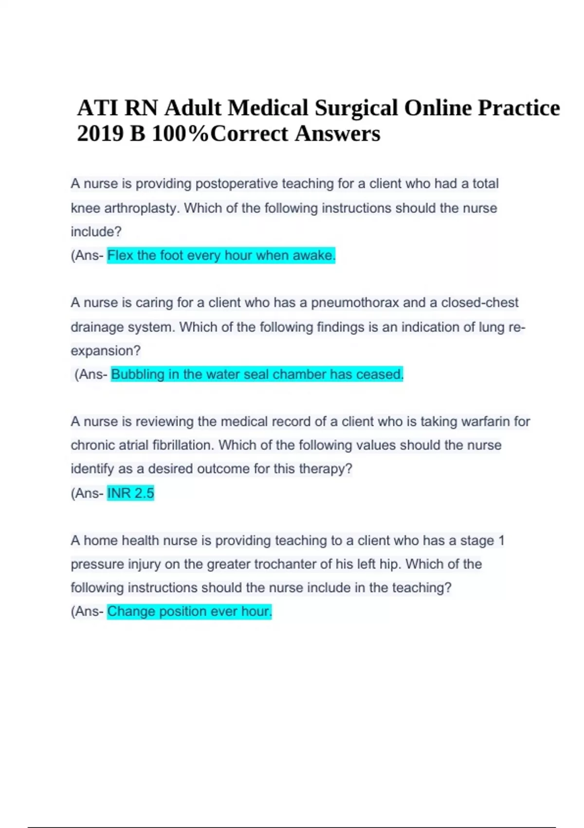 ATI RN Adult Medical Surgical Online Practice 2019 B 100%Correct Answers. A nurse is providing postoperative teaching for a client who had a total knee arthroplasty. Which of the following instructions should the nurse include? (Ans- Flex the foot every hour when awake. A nurse is caring for a client who has a pneumothorax and a closed-chest drainage system. Which of the following findings is an indication of lung reexpansion? (Ans- Bubbling in the water seal chamber has ceased. A nurse is reviewing the medical record of a client who is taking warfarin for chronic atrial fibrillation. Which of the following values should the nurse identify as a desired outcome for this therapy? (Ans- INR 2.5 A home health nurse is providing teaching to a client who has a stage 1 pressure injury on the greater trochanter of his left hip. Which of the following instructions should the nurse include in the teaching? (Ans- Change position ever hour. ATI RN Adult Medical Surgical Online Practice 2019 B 100%Correct Answers A nurse is assessing a client following the completion of hemodialysis. Which of the following findings is the nurse's priority to report to the provider? (Ans- Restlessness A nurse is caring for a client who is 8 hr postoperative following a total hip arthroplasty. The client is unable to void on the bedpan. Which of the following actions should the nurse take first? (Ans- Scan the bladder with a portable ultrasound. A nurse is planning a health promotional presentation for a group of African American clients at a community center. Which of the following disorders presents the greatest risk to this group of clients? (Ans- Hypertension A nurse is caring for a client who has DKA. Which of the following findings should indicate to the nurse that the client's condition is improving? (Ans- Glucose 272 mg/dL A nurse is caring for a client following extubation of an endotracheal tube 10 min. ago. Which of the following findings should the nurse report to the provider immediately? (Ans- Stridor A nurse is caring for a client who had a nephrostomy tube inserted 112 hr ago. Which of the following findings should the nurse report to the provider? (Ans- The client reports back pain. A nurse is admitting a client who has active TB. Which of the following types of transmission precautions should the nurse initiate? (Ans- Airborne A nurse is planning care for a client who has a sealed radiation implant for cervical cancer. Which of the following interventions should the nurse include in the plan of care? (Ans- Keep a lead-lined container in the client's room. A nurse is assessing a client who is postoperative following a thyroidectomy. Which of the following findings is the nurse's priority? (Ans- Temperature 38.9 C .