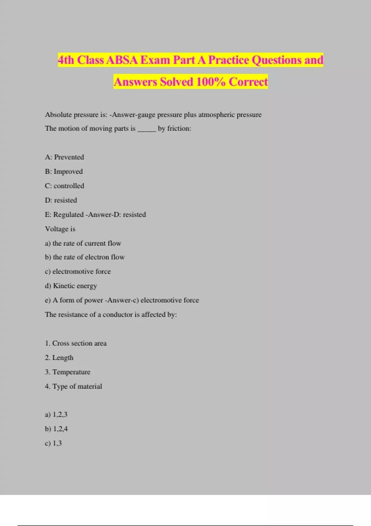 4th Class ABSA Exam Part A Practice Questions and Answers Solved 100% Correct