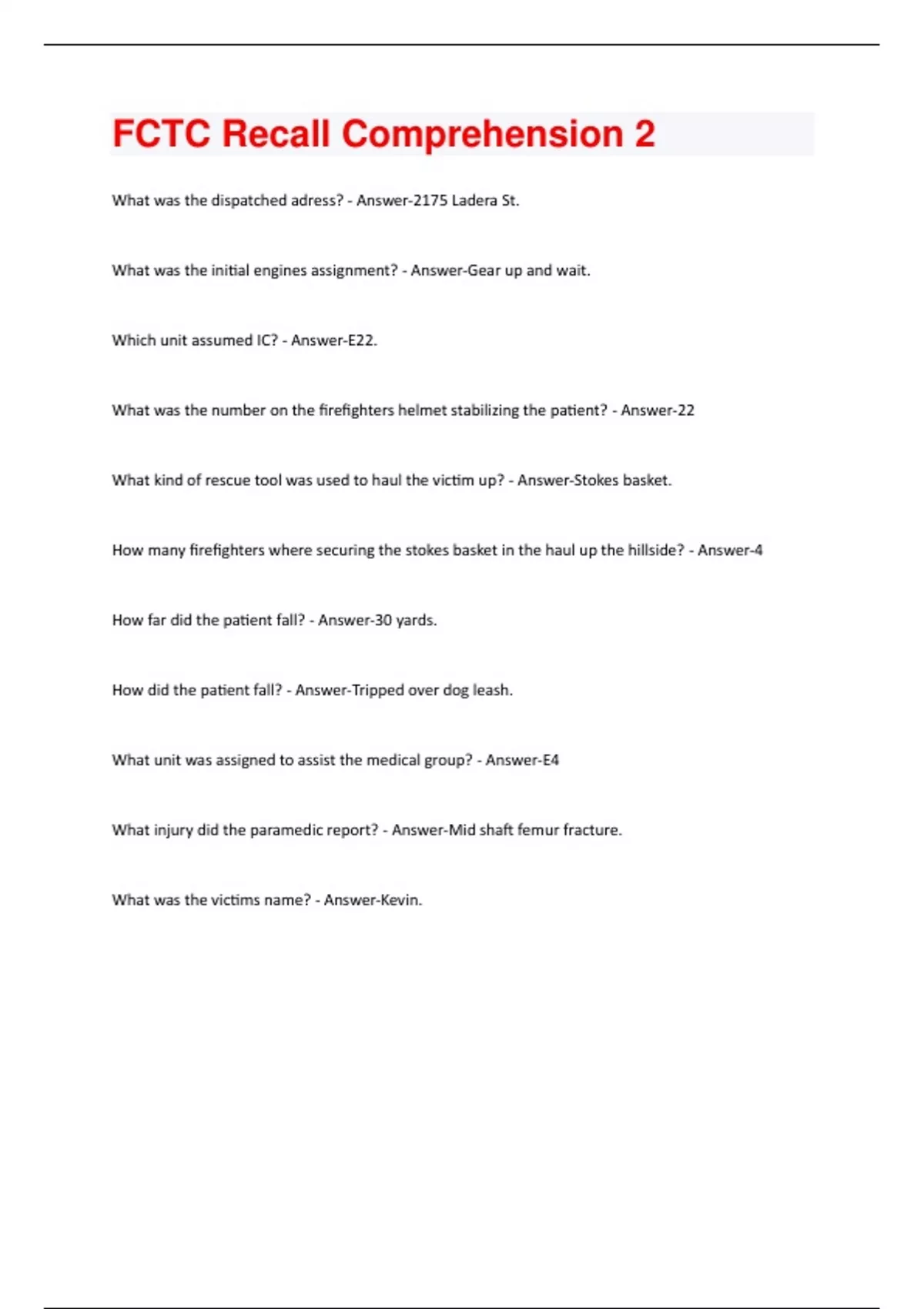 What was the dispatched adress? - Answer-2175 Ladera St. What was the initial engines assignment? - Answer-Gear up and wait. Which unit assumed IC? - Answer-E22. What was the number on the firefighters helmet stabilizing the patient? - Answer-22 What kind of rescue tool was used to haul the victim up? - Answer-Stokes basket. How many firefighters where securing the stokes basket in the haul up the hillside? - Answer-4 How far did the patient fall? - Answer-30 yards. How did the patient fall? - Answer-Tripped over dog leash. What unit was assigned to assist the medical group? - Answer-E4 What injury did the paramedic report? - Answer-Mid shaft femur fracture. What was the victims name? - Answer-Kevin.