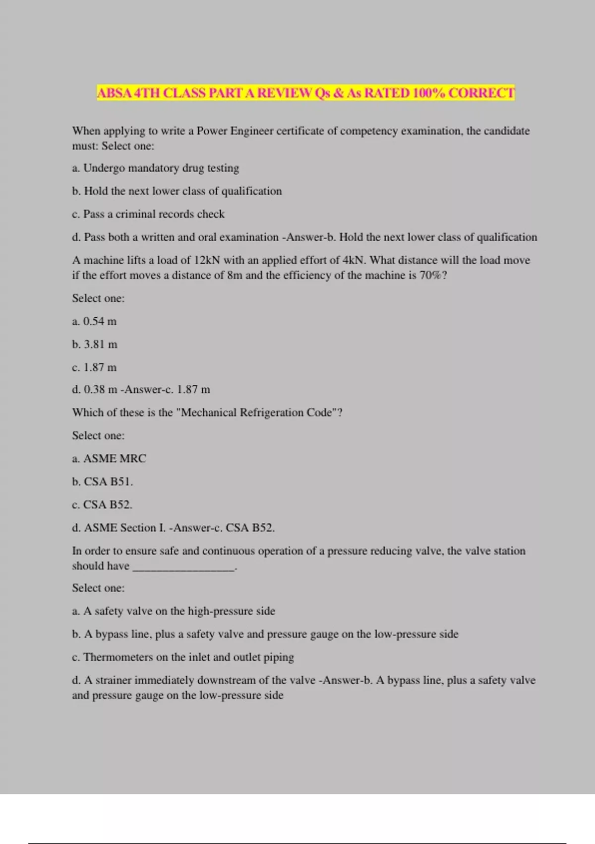 ABSA 4TH CLASS PART A REVIEW Qs & As RATED 100% CORRECT When applying to write a Power Engineer certificate of competency examination, the candidate must: Select one: a. Undergo mandatory drug testing b. Hold the next lower class of qualification c. Pass a criminal records check d. Pass both a written and oral examination -Answer-b. Hold the next lower class of qualification A machine lifts a load of 12kN with an applied effort of 4kN. What distance will the load move if the effort moves a distance of 8m and the efficiency of the machine is 70%? Select one: a. 0.54 m b. 3.81 m c. 1.87 m d. 0.38 m -Answer-c. 1.87 m Which of these is the "Mechanical Refrigeration Code"? Select one: a. ASME MRC b. CSA B51. c. CSA B52. d. ASME Section I. -Answer-c. CSA B52. In order to ensure safe and continuous operation of a pressure reducing valve, the valve station should have _________________. Select one: a. A safety valve on the high-pressure side b. A bypass line, plus a safety valve and pressure gauge on the low-pressure side c. Thermometers on the inlet and outlet piping d. A strainer immediately downstream of the valve -Answer-b. A bypass line, plus a safety valve and pressure gauge on the low-pressure side If the power dissipated by a resistor is 1.2 kW when supplied with 110 V, the amperage will be _____ A. Select one: a. 91.666 b. 19.006 c. 10.91 d. 132 -Answer-c. 10.91 The inclined "U" tube manometer: Select one: a. Will measure pressure in MPa b. Can only be used with mercury c. Is more accurate than the "U" tube manometer d. Is more difficult to read than the U-tube manometer -Answer-c. Is more accurate than the "U" tube manometer A valve which gives good throttling action, takes less actuator force, but does not seal well is a: Select one: a. Double seated valve b. Reverse acting valve c. Single seated valve d. Direct acting valve -Answer-a. Double seated valve The main component of any computer is the: Select one: a. Keyboard b. Screen c. Memory d. Central processing unit -Answer-d. Central processing unit In most sizes of pipe, Schedule 40 corresponds to _____ wall thickness. Select one: a. Welded only b. Threaded only c. Extra strong (XS) d. Standard -Answer-d. Standard A reducing agent or fuel could be: Select one: a. Carbon monoxide b. A heavy metal oxide c. Hydrogen peroxide d. Concentrated Sulphuric acid -Answer-a. Carbon monoxide A control device which will change one form of energy into another form of energy is the: Select one: a. Logic device b. Primary element c. Transducer d. Transmitter -Answer-c. Transducer The __________ valve requires specific and routine lubrication. Select one: a. Butterfly b. Globe c. Check d. Tapered plug -Answer-d. Tapered plug With reference to scalars and vectors, a space diagram: Select one: a. Shows the relationship of time to the vector. b. Illustrates a system of vectors. c. Shows the relationship of the scalar to the vector. d. Illustrates a system of scalars. -Answer-b. Illustrates a system of vectors Brass and bronze are alloys of: Select one: a. iron b. copper c. aluminum d. lead -Answer-b. copper PLC's for Burner Management Systems can: Select one: a. Have limited field configurations b. Be used without any field testing c. Be set up by technicians at burner repair companies d. Be programmed by operators -Answer-a. Have limited field configurations Which is the workers responsibility? Select one: a. Co-operating with others on workplace safety and health b. Issuing proper safety equipment to all workers c. Clearly stated goals and objectives of the health and safety program d. Clearly defined roles and responsibilities for management, workers, contractors, and visitors at the plant site -Answer-a. Co-operating with others on workplace safety and health What is one of the two main purposes of the CSA B-52 code? Select one: a. (b) & (d) b. To promote uniform requirements among the provinces and territories c. Terms and equipment relating to refrigeration and air conditioning equipment are defined. d. The various classifications of buildings and occupancies are listed and described with examples of each classification given. -Answer-b. To promote uniform requirements among the provinces and territories Settling ponds and grease traps are