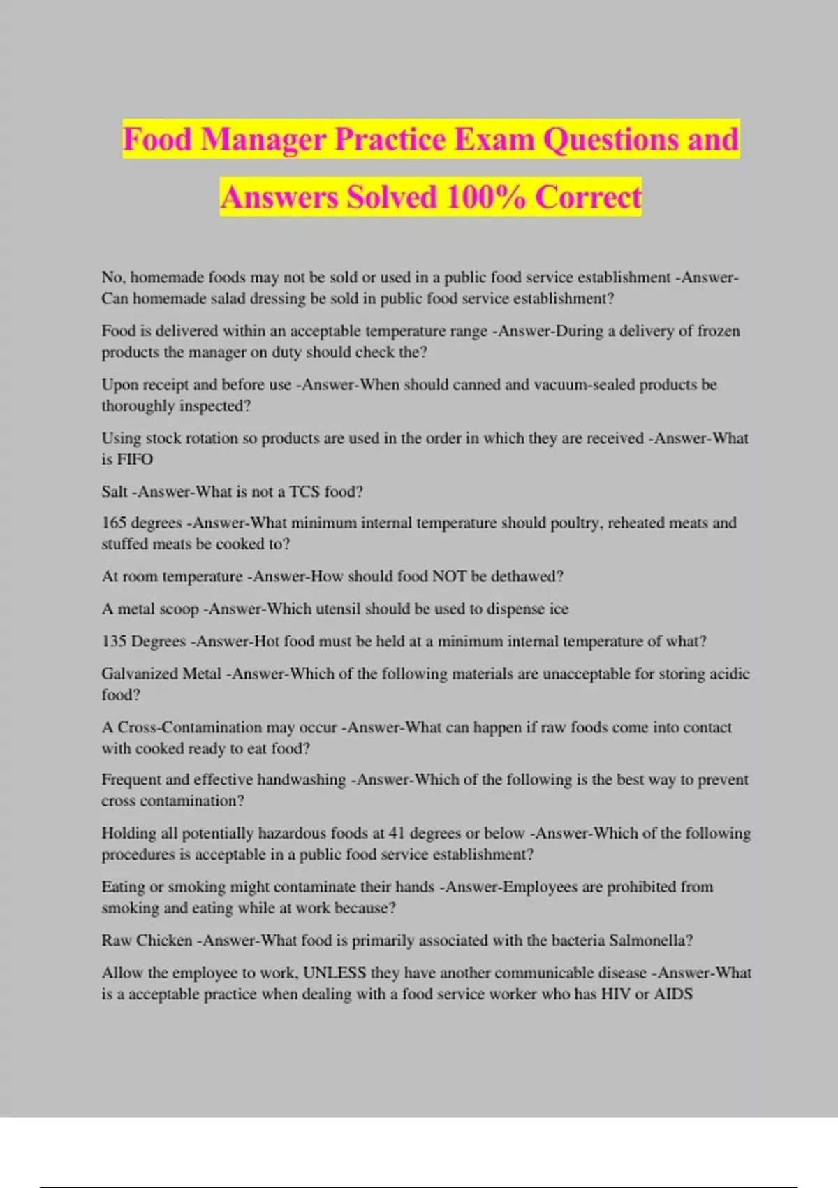 Food Manager Practice Exam Questions and Answers Solved 100% Correct No, homemade foods may not be sold or used in a public food service establishment -Answer- Can homemade salad dressing be sold in public food service establishment? Food is delivered within an acceptable temperature range -Answer-During a delivery of frozen products the manager on duty should check the? Upon receipt and before use -Answer-When should canned and vacuum-sealed products be thoroughly inspected? Using stock rotation so products are used in the order in which they are received -Answer-What is FIFO Salt -Answer-What is not a TCS food? 165 degrees -Answer-What minimum internal temperature should poultry, reheated meats and stuffed meats be cooked to? At room temperature -Answer-How should food NOT be dethawed? A metal scoop -Answer-Which utensil should be used to dispense ice 135 Degrees -Answer-Hot food must be held at a minimum internal temperature of what? Galvanized Metal -Answer-Which of the following materials are unacceptable for storing acidic food? A Cross-Contamination may occur -Answer-What can happen if raw foods come into contact with cooked ready to eat food? Frequent and effective handwashing -Answer-Which of the following is the best way to prevent cross contamination? Holding all potentially hazardous foods at 41 degrees or below -Answer-Which of the following procedures is acceptable in a public food service establishment? Eating or smoking might contaminate their hands -Answer-Employees are prohibited from smoking and eating while at work because? Raw Chicken -Answer-What food is primarily associated with the bacteria Salmonella? Allow the employee to work, UNLESS they have another communicable disease -Answer-What is a acceptable practice when dealing with a food service worker who has HIV or AIDS Wash the wound, use a water resistant bandage and cover the bandage with a single use glove or finger cot -Answer-What should you do if an employee has a minor cut? Only in designated handwashing areas -Answer-Which of the following is an acceptable area for employee handwashing? Single use disposable paper towels -Answer-Which of the following is an acceptable method for hand drying