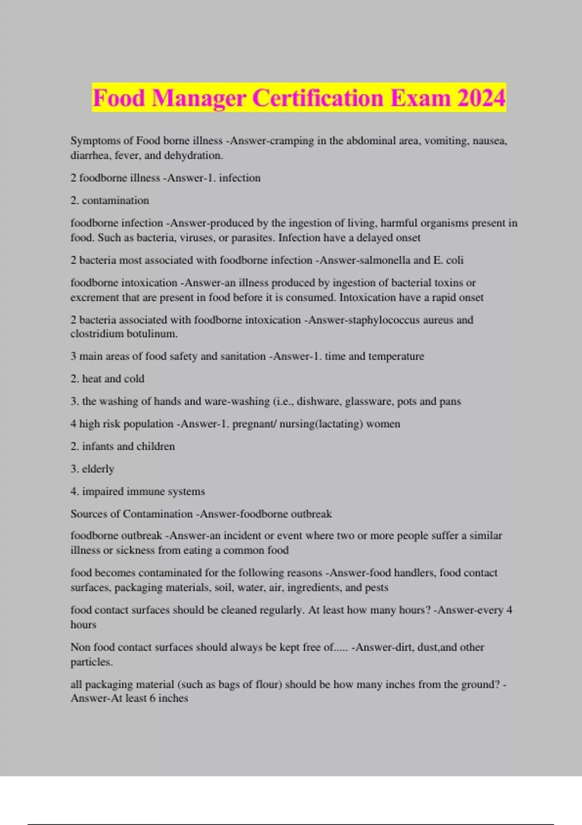 Food Manager Certification Exam 2024 Symptoms of Food borne illness -Answer-cramping in the abdominal area, vomiting, nausea, diarrhea, fever, and dehydration. 2 foodborne illness -Answer-1. infection 2. contamination foodborne infection -Answer-produced by the ingestion of living, harmful organisms present in food. Such as bacteria, viruses, or parasites. Infection have a delayed onset 2 bacteria most associated with foodborne infection -Answer-salmonella and E. coli foodborne intoxication -Answer-an illness produced by ingestion of bacterial toxins or excrement that are present in food before it is consumed. Intoxication have a rapid onset 2 bacteria associated with foodborne intoxication -Answer-staphylococcus aureus and clostridium botulinum. 3 main areas of food safety and sanitation -Answer-1. time and temperature 2. heat and cold 3. the washing of hands and ware-washing (i.e., dishware, glassware, pots and pans 4 high risk population -Answer-1. pregnant/ nursing(lactating) women 2. infants and children 3. elderly 4. impaired immune systems Sources of Contamination -Answer-foodborne outbreak foodborne outbreak -Answer-an incident or event where two or more people suffer a similar illness or sickness from eating a common food food becomes contaminated for the following reasons -Answer-food handlers, food contact surfaces, packaging materials, soil, water, air, ingredients, and pests food contact surfaces should be cleaned regularly. At least how many hours? -Answer-every 4 hours Non food contact surfaces should always be kept free of..... -Answer-dirt, dust,and other particles. all packaging material (such as bags of flour) should be how many inches from the ground? - Answer-At least 6 inches Food contaminants can be grouped into what 4 catergories -Answer-1. biological 2. physical 3. chemical 4. cross contamination biological -Answer-anything that pertains to life and or living things physical contaminants -Answer-are objects that can be seen with the human eye such as nails, hair, and bandages chemical contamination -Answer-can occur if an employee prepares acidic food using a copper pot cross contamination -Answer-is the transfer of pathogens or disease causing micro organisms from one food to another. What are the 4 biological hazards -Answer-1. bacteria 2. viruses 3. parasites 4. fungi bacterial foodborne illnesses account for more than how many percentage of all foodborne related illness -Answer-90% what is the danger zone -Answer-41 degrees F- 135 degrees F The maximum accumulated time that food can remain in the danger zone is how many hours - Answer-4 bacteria doubles every how many minutes -Answer-20 when bacteria are multiplying, it consumes the nutrients in foods, and then produces waste products or metabolic by products called. They may look and feel like slime, such as the one formed on old fish or meat -Answer-Toxins Spores -Answer-bacteria have the ability to change into forms that are very resistant to heat and dry conditions. They are characterized by the formation of a thick "shell" Most common types of bacteria -Answer-E. Coli., salmonella, clostridium botulinum, E. Coli. -Answer-Found in human intestines and other warm-blooded animals. It can contaminate food and water. some type can cause serious diseases such as the on termed O157:H7. ground beef needs to be cooked to a minimum internal temperature of 155 degrees Fahrenheit for at least 15 seconds. commonly found in ground beef, raw fruits and vegetables, unpasteurized juices such as apple cider, and even uncommon source like animals in a petting zoo. 90 percent of E. Coli outbreaks are connected to under cooked ground beef. Salmonella -Answer-found especially in poultry and eggs including their shells, in human intestines, and in domestic and wild animals. salmonella can also be found in pets, roaches, and rodents. they can also be found in unpasteurized milk and dairy products. salmonella can be killed in poultry by cookingto an internal temperature of 165 degrees for 15 seconds. Clostridium Botulinum -Answer-can form spores and grow without oxygen, making it a type of anaerobic bacteria. It can affect the central nervous system. The toxin produced by the botulinum bacteria can produce sever paralysis and even death. Some