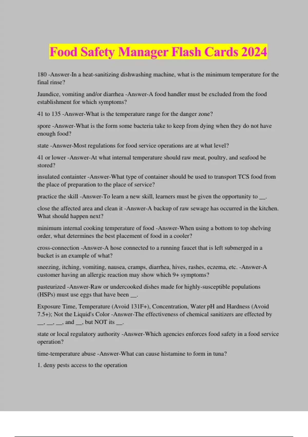 Food Safety Manager Flash Cards 2024