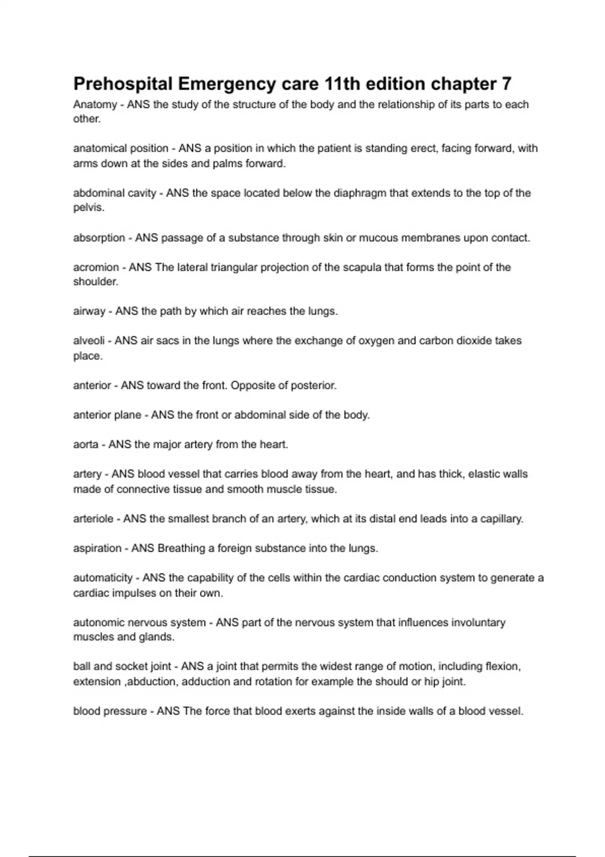 Prehospital Emergency care 11th edition chapter 7 Anatomy - ANS the study of the structure of the body and the relationship of its parts to each other. anatomical position - ANS a position in which the patient is standing erect, facing forward, with arms down at the sides and palms forward. abdominal cavity - ANS the space located below the diaphragm that extends to the top of the pelvis. absorption - ANS passage of a substance through skin or mucous membranes upon contact. acromion - ANS The lateral triangular projection of the scapula that forms the point of the shoulder. airway - ANS the path by which air reaches the lungs.