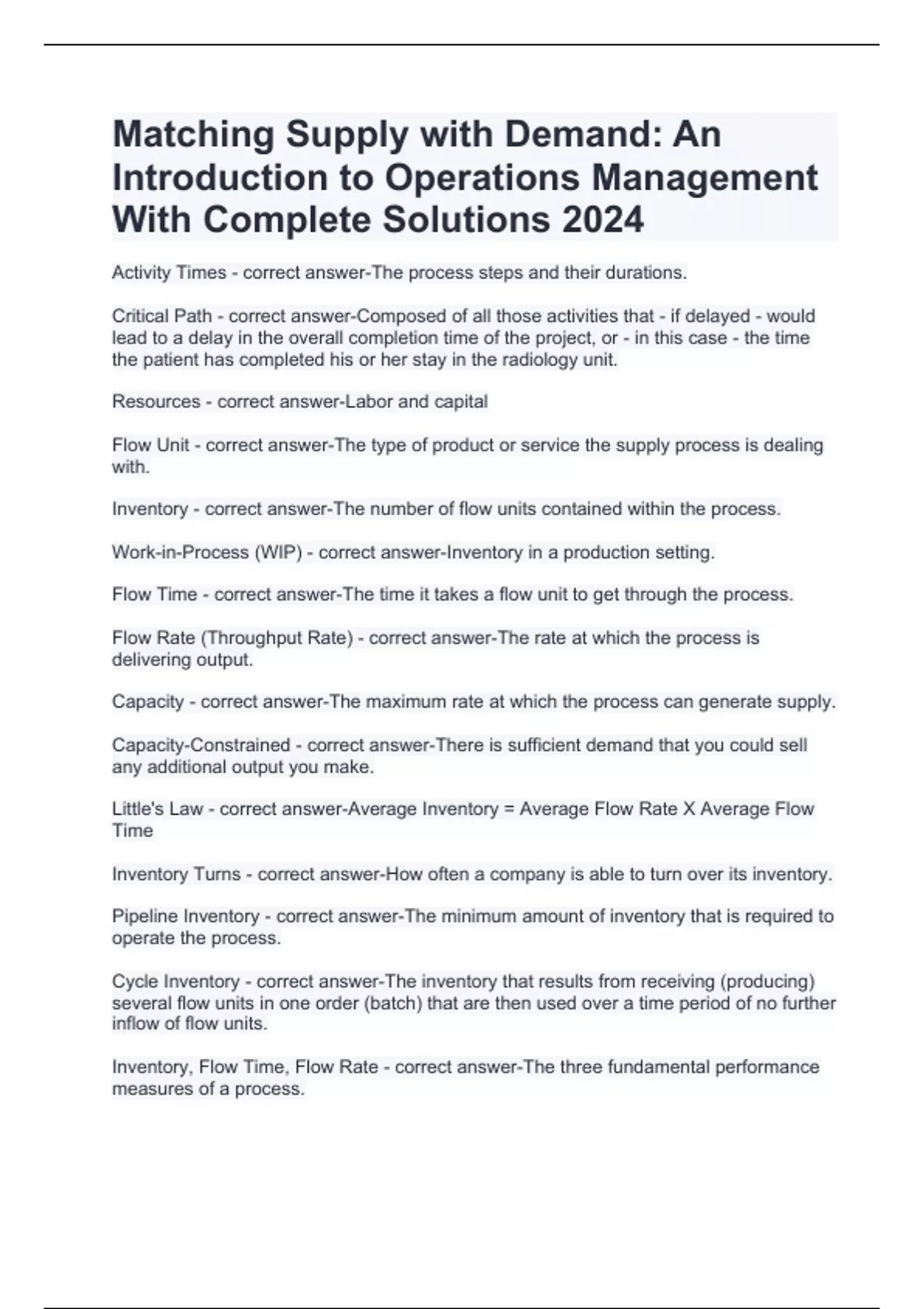 Matching Supply with Demand: An Introduction to Operations Management With Complete Solutions 2024Matching Supply with Demand: An Introduction to Operations Management With Complete Solutions 2024 Activity Times - correct answer-The process steps and their durations. Critical Path - correct answer-Composed of all those activities that - if delayed - would lead to a delay in the overall completion time of the project, or - in this case - the time the patient has completed his or her stay in the radiology unit. Resources - correct answer-Labor and capital Flow Unit - correct answer-The type of product or service the supply process is dealing with. Inventory - correct answer-The number of flow units contained within the process. Work-in-Process (WIP) - correct answer-Inventory in a production setting. Flow Time - correct answer-The time it takes a flow unit to get through the process. Flow Rate (Throughput Rate) - correct answer-The rate at which the process is delivering output. Capacity - correct answer-The maximum rate at which the process can generate supply. Capacity-Constrained - correct answer-There is sufficient demand that you could sell any additional output you make. Little's Law - correct answer-Average Inventory = Average Flow Rate X Average Flow Time Inventory Turns - correct answer-How often a company is able to turn over its inventory. Pipeline Inventory - correct answer-The minimum amount of inventory that is required to operate the process. Cycle Inventory - correct answer-The inventory that results from receiving (producing) several flow units in one order (batch) that are then used over a time period of no further inflow of flow units. Inventory, Flow Time, Flow Rate - correct answer-The three fundamental performance measures of a process. Process Capacity - correct answer-The maximum flow rate that can be achieved in the process. Process Flow Diagram - correct answer-Maps resources and inventory and shows graphically how the flow unit travels through the process in its transformation from input to output. Bottleneck - correct answer-The resource with the lowest capacity in the process. Demand-Constrained - correct answer-A process for which the flow rate is limited by demand. Supply-Constrained - correct answer-A process for which the flow rate is limited by either capacity or the availability of input. Utilization - correct answer-Flow Rate / Capacity Implied Utilization - correct answer-Demand / Capacity Workload - correct answer-The request for capacity created by demand. Processing Time - correct answer-The duration that a flow unit has to spend at a resource, not including any waiting time; also referred to as activity time or service time. Cycle Time - correct answer-The time that passes between two consecutive flow units leaving a process. = 1/Flow Rate Worker-Paced Line - correct answer-A process in which a worker moves the flow unit to the next resource or buffer when he or she has completed processing it; in contrast to a machine-paced line, where the flow unit moves based on a conveyer belt. Labor Content - correct answer-The amount of labor that is spent on a flow unit from the beginning to the end of the process. In a purely manual process, it is the sum of all the activity times. Average Labor Utilization - correct answer-The average utilization across resources. Idle Time - correct answer-The time a resource is not processing a flow unit. Line Balancing - correct answer-The process of evenly distributing work across the resources of a process. Tasks - correct answer-The atomic pieces of work that together constitute activities.