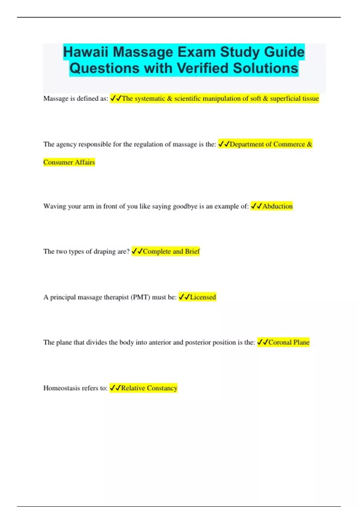 Hawaii Massage Exam Study Guide Questions with Verified Solutions