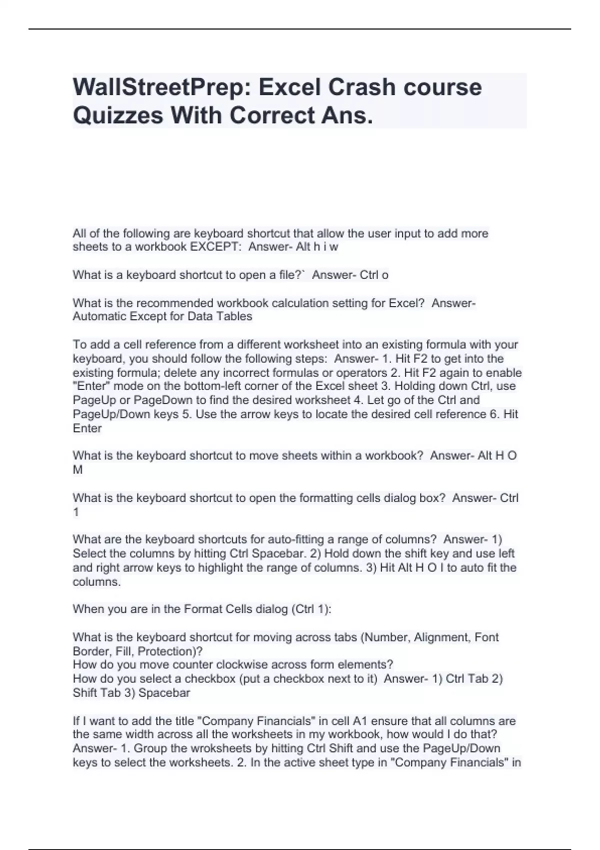 WallStreetPrep: Excel Crash course Quizzes With Correct Ans.