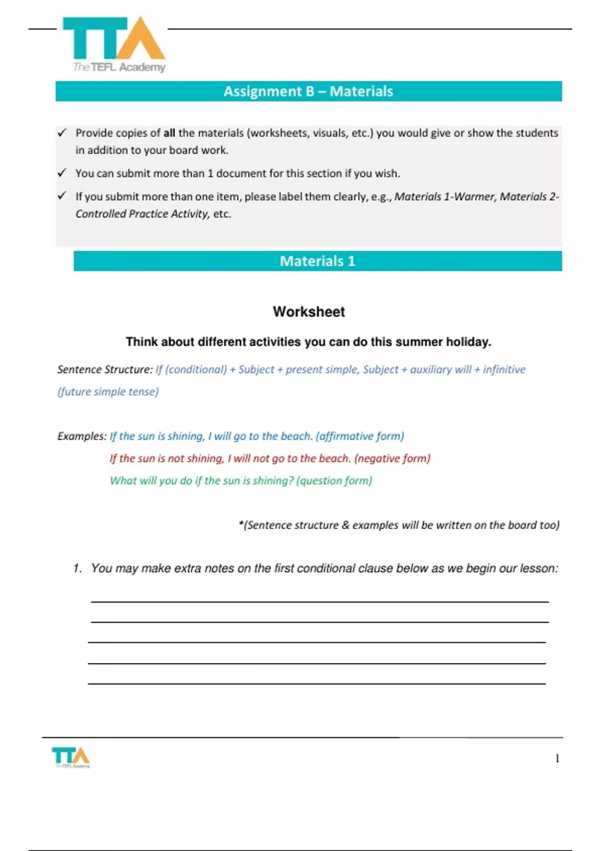Materials 1 Worksheet Think about different activities you can do this summer holiday. Sentence Structure: If (conditional) + Subject + present simple, Subject + auxiliary will + infinitive (future simple tense) Examples: If the sun is shining, I will go to the beach. (affirmative form) If the sun is not shining, I will not go to the beach. (negative form) What will you do if the sun is shining? (question form) *(Sentence structure & examples will be written on the board too) 1. You may make extra notes on the first conditional clause below as we begin our lesson: