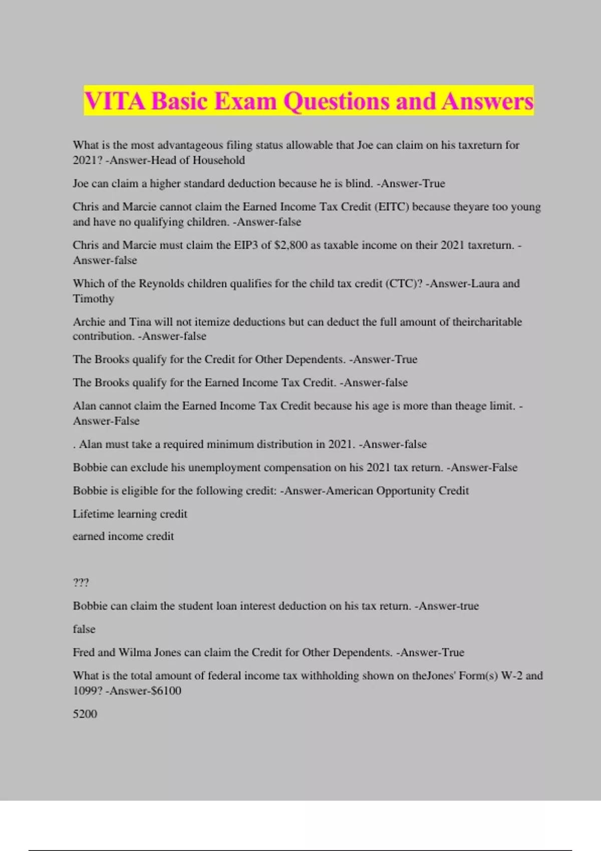 VITA Basic Exam Questions and Answers What is the most advantageous filing status allowable that Joe can claim on his taxreturn for 2021? -Answer-Head of Household Joe can claim a higher standard deduction because he is blind. -Answer-True Chris and Marcie cannot claim the Earned Income Tax Credit (EITC) because theyare too young and have no qualifying children. -Answer-false Chris and Marcie must claim the EIP3 of $2,800 as taxable income on their 2021 taxreturn. - Answer-false Which of the Reynolds children qualifies for the child tax credit (CTC)? -Answer-Laura and Timothy Archie and Tina will not itemize deductions but can deduct the full amount of theircharitable contribution. -Answer-false The Brooks qualify for the Credit for Other Dependents. -Answer-True The Brooks qualify for the Earned Income Tax Credit. -Answer-false Alan cannot claim the Earned Income Tax Credit because his age is more than theage limit. - Answer-False . Alan must take a required minimum distribution in 2021. -Answer-false Bobbie can exclude his unemployment compensation on his 2021 tax return. -Answer-False Bobbie is eligible for the following credit: -Answer-American Opportunity Credit Lifetime learning credit