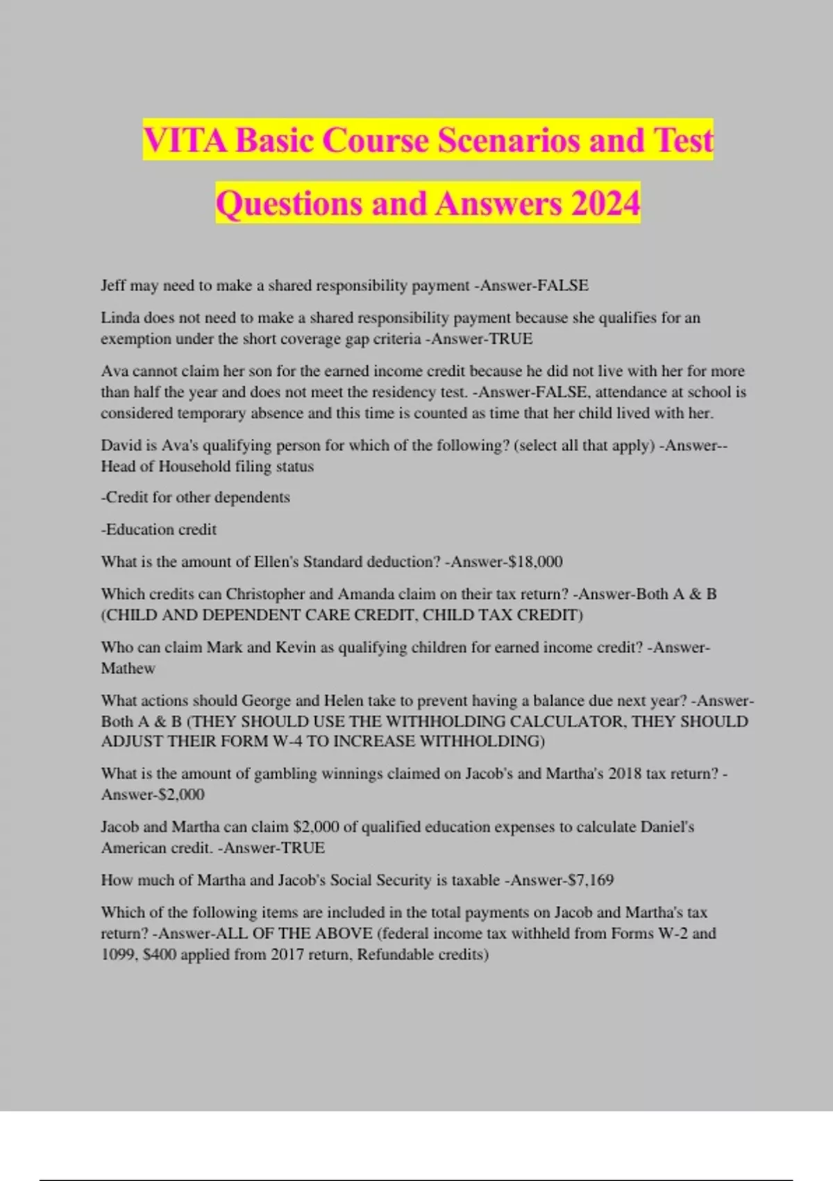 VITA Basic Course Scenarios and Test Questions and Answers 2024 Jeff may need to make a shared responsibility payment -Answer-FALSE Linda does not need to make a shared responsibility payment because she qualifies for an exemption under the short coverage gap criteria -Answer-TRUE Ava cannot claim her son for the earned income credit because he did not live with her for more than half the year and does not meet the residency test. -Answer-FALSE, attendance at school is considered temporary absence and this time is counted as time that her child lived with her. David is Ava's qualifying person for which of the following? (select all that apply) -Answer-- Head of Household filing status -Credit for other dependents -Education credit What is the amount of Ellen's Standard deduction? -Answer-$18,000 Which credits can Christopher and Amanda claim on their tax return? -Answer-Both A & B (CHILD AND DEPENDENT CARE CREDIT, CHILD TAX CREDIT) Who can claim Mark and Kevin as qualifying children for earned income credit? -Answer- Mathew What actions should George and Helen take to prevent having a balance due next year? -Answer- Both A & B (THEY SHOULD USE THE WITHHOLDING CALCULATOR, THEY SHOULD ADJUST THEIR FORM W-4 TO INCREASE WITHHOLDING)