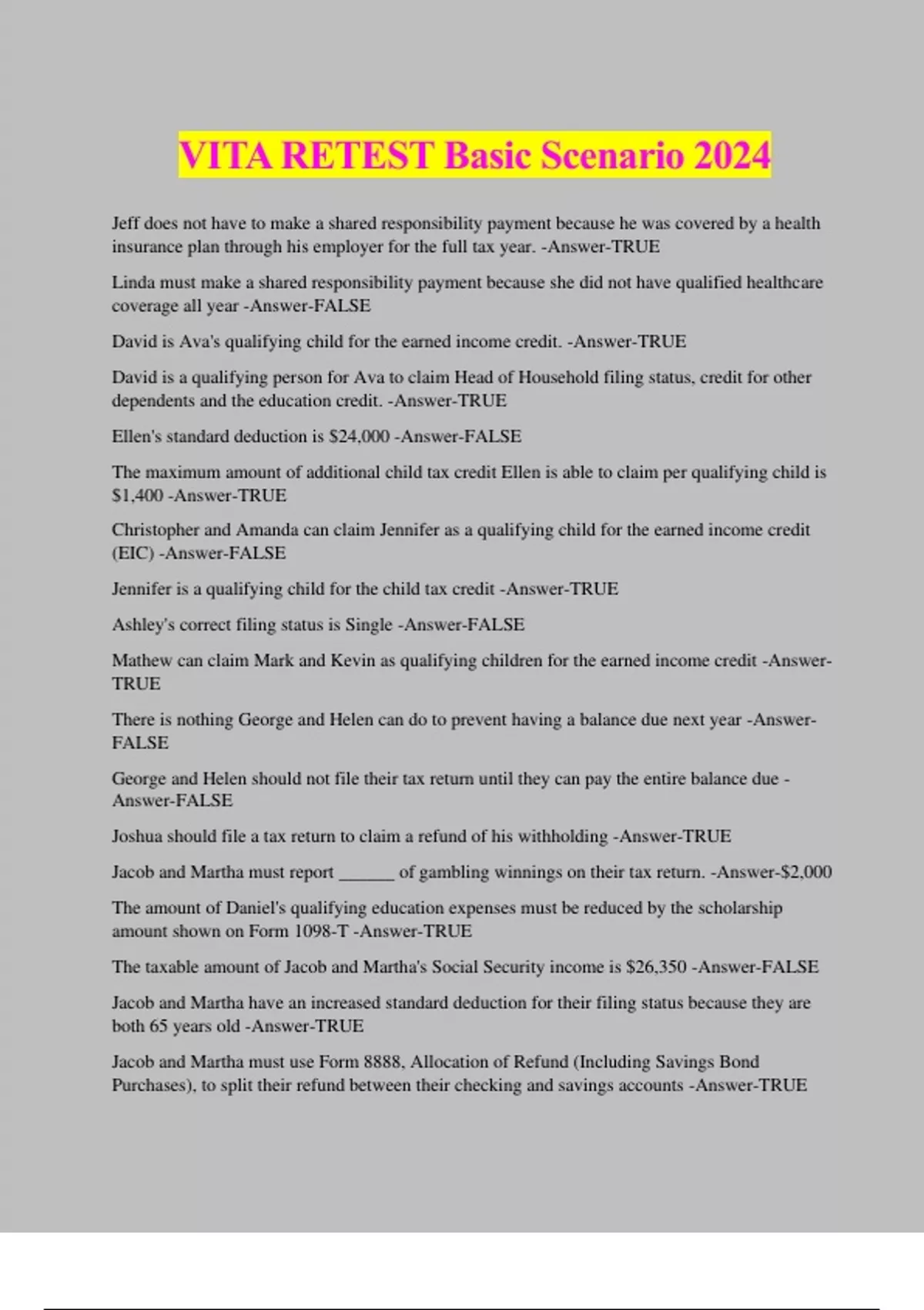 VITA RETEST Basic Scenario 2024 Jeff does not have to make a shared responsibility payment because he was covered by a health insurance plan through his employer for the full tax year. -Answer-TRUE Linda must make a shared responsibility payment because she did not have qualified healthcare coverage all year -Answer-FALSE David is Ava's qualifying child for the earned income credit. -Answer-TRUE David is a qualifying person for Ava to claim Head of Household filing status, credit for other dependents and the education credit. -Answer-TRUE Ellen's standard deduction is $24,000 -Answer-FALSE The maximum amount of additional child tax credit Ellen is able to claim per qualifying child is $1,400 -Answer-TRUE Christopher and Amanda can claim Jennifer as a qualifying child for the earned income credit (EIC) -Answer-FALSE Jennifer is a qualifying child for the child tax credit -Answer-TRUE