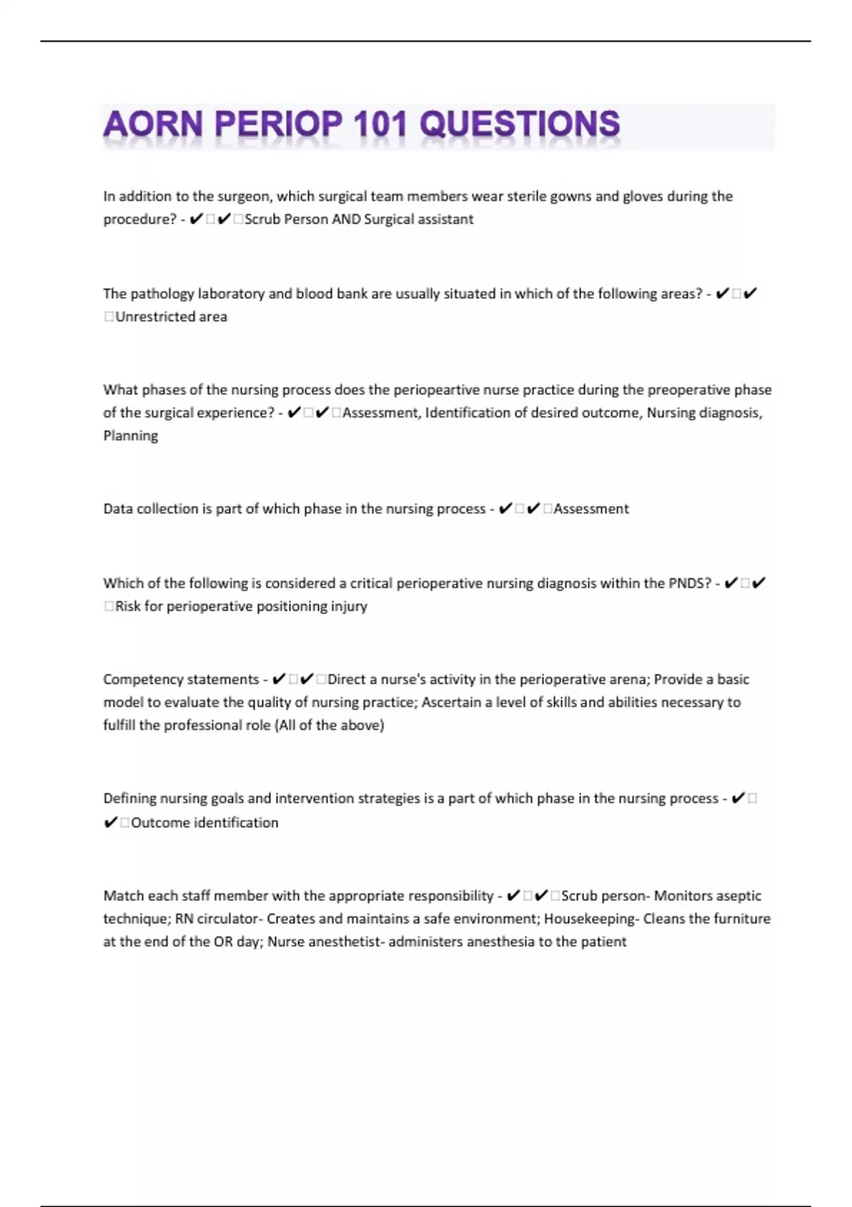 In addition to the surgeon, which surgical team members wear sterile gowns and gloves during the procedure? - ️️Scrub Person AND Surgical assistant The pathology laboratory and blood bank are usually situated in which of the following areas? - ️️Unrestricted area What phases of the nursing process does the periopeartive nurse practice during the preoperative phase of the surgical experience? - ️️Assessment, Identification of desired outcome, Nursing diagnosis, Planning Data collection is part of which phase in the nursing process - ️️Assessment Which of the following is considered a critical perioperative nursing diagnosis within the PNDS? - ️️Risk for perioperative positioning injury Competency statements - ️️Direct a nurse's activity in the perioperative arena; Provide a basic model to evaluate the quality of nursing practice; Ascertain a level of skills and abilities necessary to fulfill the professional role (All of the above) Defining nursing goals and intervention strategies is a part of which phase in the nursing process - ️️Outcome identification Match each staff member with the appropriate responsibility - ️️Scrub person- Monitors aseptic technique; RN circulator- Creates and maintains a safe environment; Housekeeping- Cleans the furniture at the end of the OR day; Nurse anesthetist- administers anesthesia to the patient