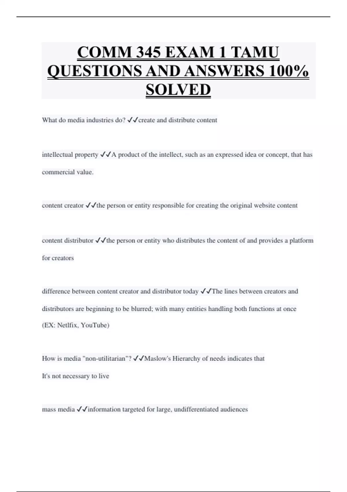 COMM 345 EXAM 1 TAMU QUESTIONS AND ANSWERS 100% SOLVED What do media industries do? create and distribute content intellectual property A product of the intellect, such as an expressed idea or concept, that has commercial value. content creator the person or entity responsible for creating the original website content content distributor the person or entity who distributes the content of and provides a platform for creators difference between content creator and distributor today The lines between creators and distributors are beginning to be blurred; with many entities handling both functions at once (EX: Netlfix, YouTube) How is media "non-utilitarian"? Maslow's Hierarchy of needs indicates that It's not necessary to live mass media information targeted for large, undifferentiated audiences