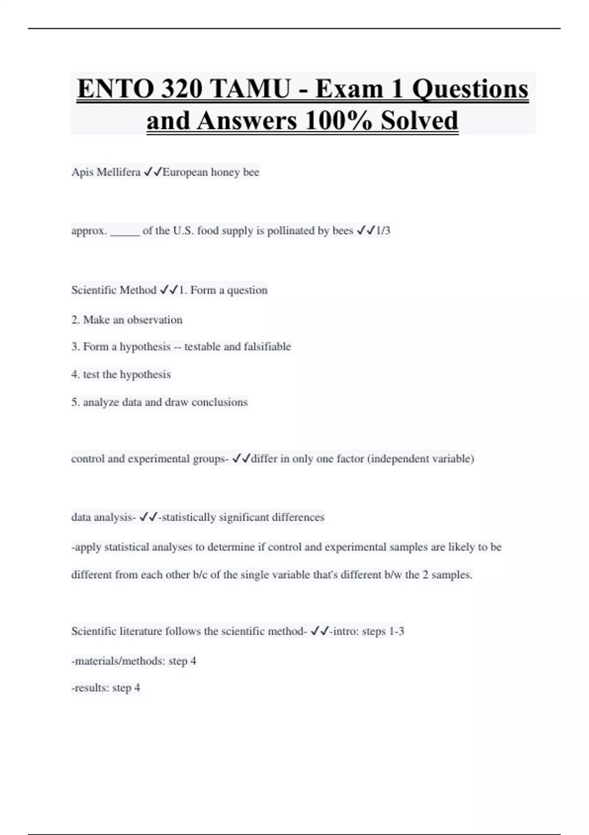 ENTO 320 TAMU - Exam 1 Questions and Answers 100% Solved Apis Mellifera European honey bee approx. _____ of the U.S. food supply is pollinated by bees 1/3 Scientific Method 1. Form a question 2. Make an observation 3. Form a hypothesis -- testable and falsifiable 4. test the hypothesis 5. analyze data and draw conclusions control and experimental groups- differ in only one factor (independent variable) data analysis- -statistically significant differences -apply statistical analyses to determine if control and experimental samples are likely to be different from each other b/c of the single variable that's different b/w the 2 samples. Scientific literature follows the scientific method- -intro: steps 1-3 -materials/methods: step 4 -results: step 4