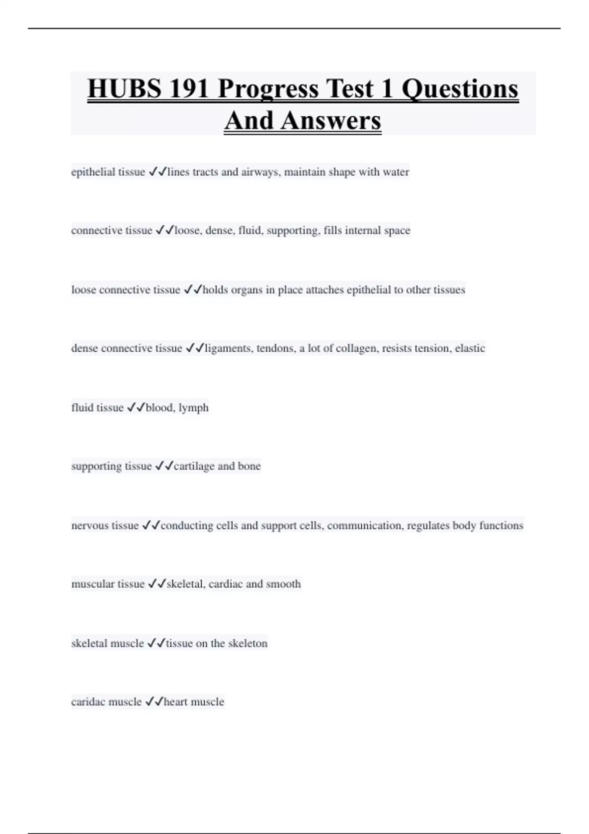 HUBS 191 Progress Test 1 Questions And Answers epithelial tissue lines tracts and airways, maintain shape with water connective tissue loose, dense, fluid, supporting, fills internal space loose connective tissue holds organs in place attaches epithelial to other tissues dense connective tissue ligaments, tendons, a lot of collagen, resists tension, elastic fluid tissue blood, lymph supporting tissue cartilage and bone nervous tissue conducting cells and support cells, communication, regulates body functions muscular tissue skeletal, cardiac and smooth skeletal muscle tissue on the skeleton caridac muscle heart muscle smooth tissue lines hollow organs i.e. blood sagital coronal Transverse long bone longer than wide, lever for movement, compact bone in diaphysis short bone mainly cancellous, similar width and length, weight bearing