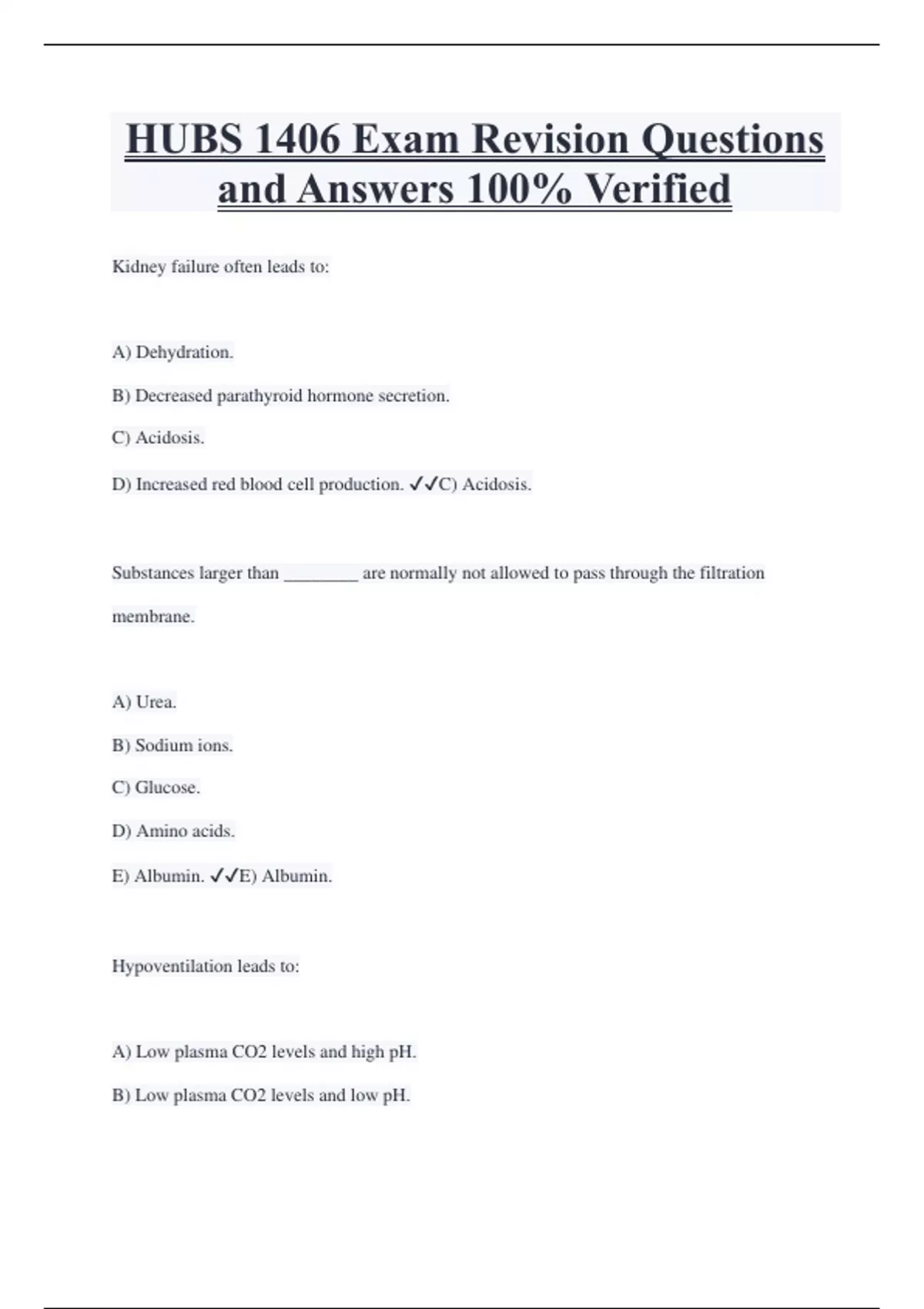 HUBS 1406 Exam Revision Questions and Answers 100% Verified Kidney failure often leads to: A) Dehydration. B) Decreased parathyroid hormone secretion. C) Acidosis. D) Increased red blood cell production. C) Acidosis. Substances larger than ________ are normally not allowed to pass through the filtration membrane. A) Urea. B) Sodium ions. C) Glucose. D) Amino acids. E) Albumin. E) Albumin. Hypoventilation leads to: A) Low plasma CO2 levels and high pH. B) Low plasma CO2 levels and low pH. C) High plasma CO2 levels and high pH. D) High plasma CO2 levels and low pH. D) High plasma CO2 levels and low pH. A person as lost a lot of blood after a large cut. Which of the following would be likely to occur as a result of the blood loss?