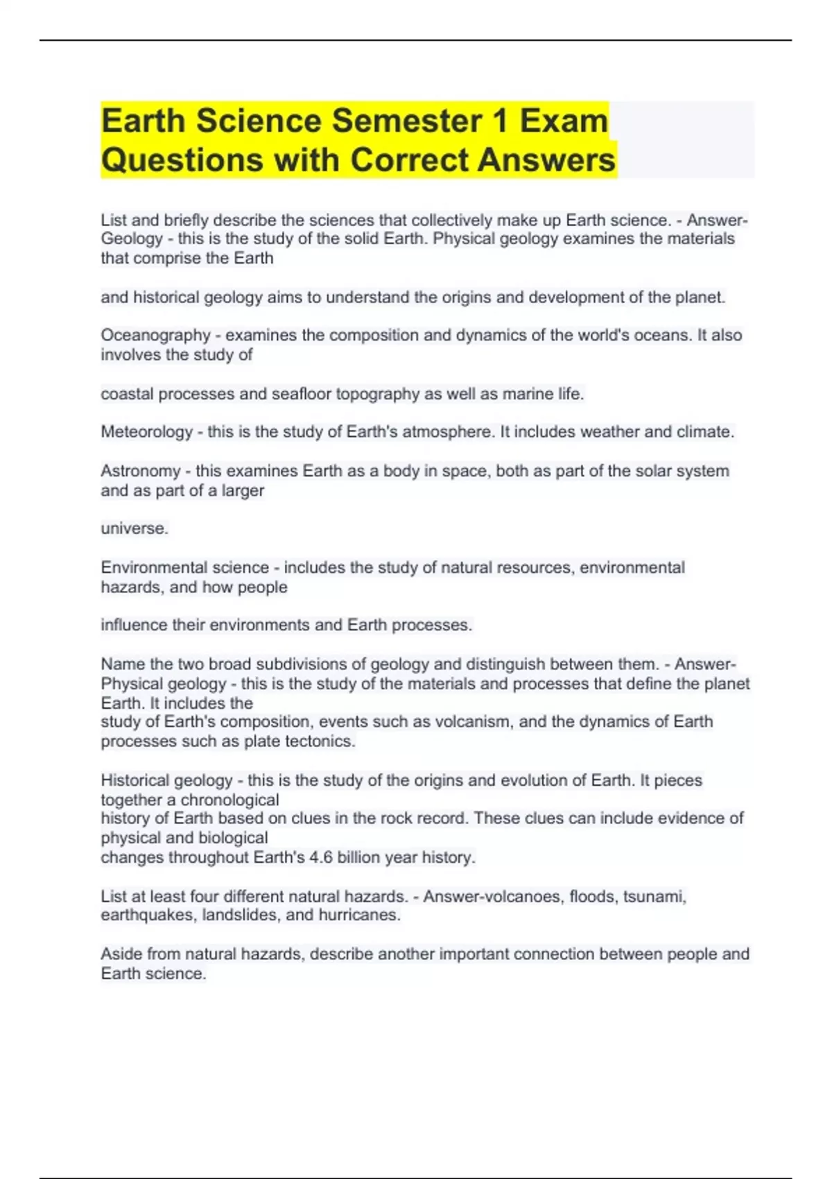 Earth Science Semester 1 Exam Questions with Correct Answers List and briefly describe the sciences that collectively make up Earth science. - Answer-Geology - this is the study of the solid Earth. Physical geology examines the materials that comprise the Earth and historical geology aims to understand the origins and development of the planet. Oceanography - examines the composition and dynamics of the world's oceans. It also involves the study of coastal processes and seafloor topography as well as marine life. Meteorology - this is the study of Earth's atmosphere. It includes weather and climate. Astronomy - this examines Earth as a body in space, both as part of the solar system and as part of a larger universe. Environmental science - includes the study of natural resources, environmental hazards, and how people influence their environments and Earth processes. Name the two broad subdivisions of geology and distinguish between them. - Answer-Physical geology - this is the study of the materials and processes that define the planet Earth. It includes the study of Earth's composition, events such as volcanism, and the dynamics of Earth processes such as plate tectonics. Historical geology - this is the study of the origins and evolution of Earth. It pieces together a chronological history of Earth based on clues in the rock record. These clues can include evidence of physical and biological changes throughout Earth's 4.6 billion year history. List at least four different natural hazards. - Answer-volcanoes, floods, tsunami, earthquakes, landslides, and hurricanes. Aside from natural hazards, describe another important connection between people and Earth science. Humans influence Earth by altering its surface. People build cities and roads, and engineer projects that alter river flooding patterns. People pollute the air, the land, and the water, changing Earth from what is its natural state. - Answer-Humans influence Earth by altering its surface. People build cities and roads, and engineer projects that alter river flooding patterns. People pollute the air, the land, and the water, changing Earth from what is its natural state. List two examples of size/place scales in Earth science that are at opposite ends of the spectrum. - Answer-A lightning flash happens within a fraction of a second but can instantly alter the immediate landscape. Uplift of mountain ranges takes tens to hundreds of millions of years to occur. How old is Earth? - Answer-4.6 billion years
