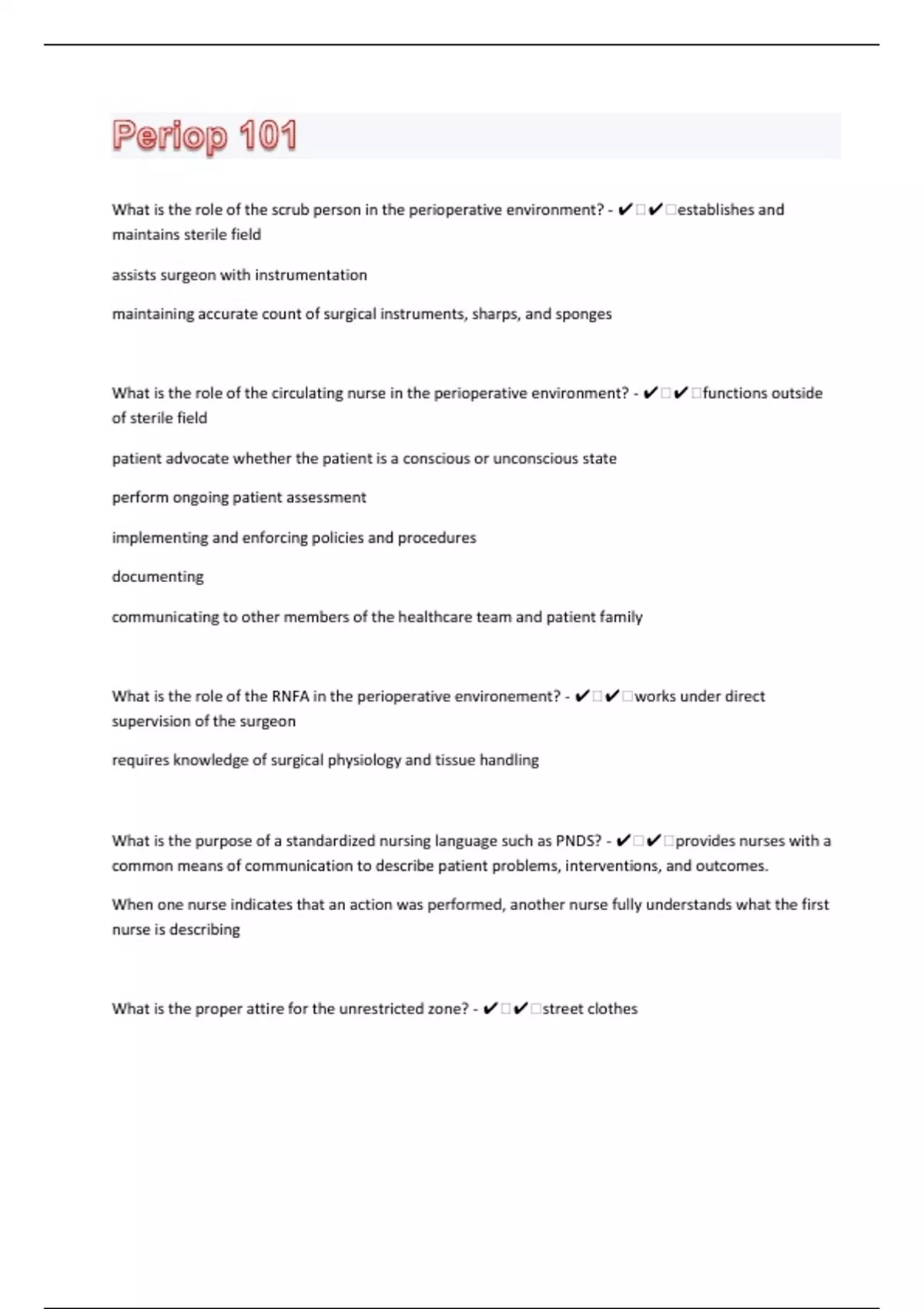 What is the role of the scrub person in the perioperative environment? - ️️establishes and maintains sterile field assists surgeon with instrumentation maintaining accurate count of surgical instruments, sharps, and sponges What is the role of the circulating nurse in the perioperative environment? - ️️functions outside of sterile field patient advocate whether the patient is a conscious or unconscious state perform ongoing patient assessment implementing and enforcing policies and procedures documenting communicating to other members of the healthcare team and patient family What is the role of the RNFA in the perioperative environement? - ️️works under direct supervision of the surgeon requires knowledge of surgical physiology and tissue handling What is the purpose of a standardized nursing language such as PNDS? - ️️provides nurses with a common means of communication to describe patient problems, interventions, and outcomes. When one nurse indicates that an action was performed, another nurse fully understands what the first nurse is describing What is the proper attire for the unrestricted zone? - ️️street clothes