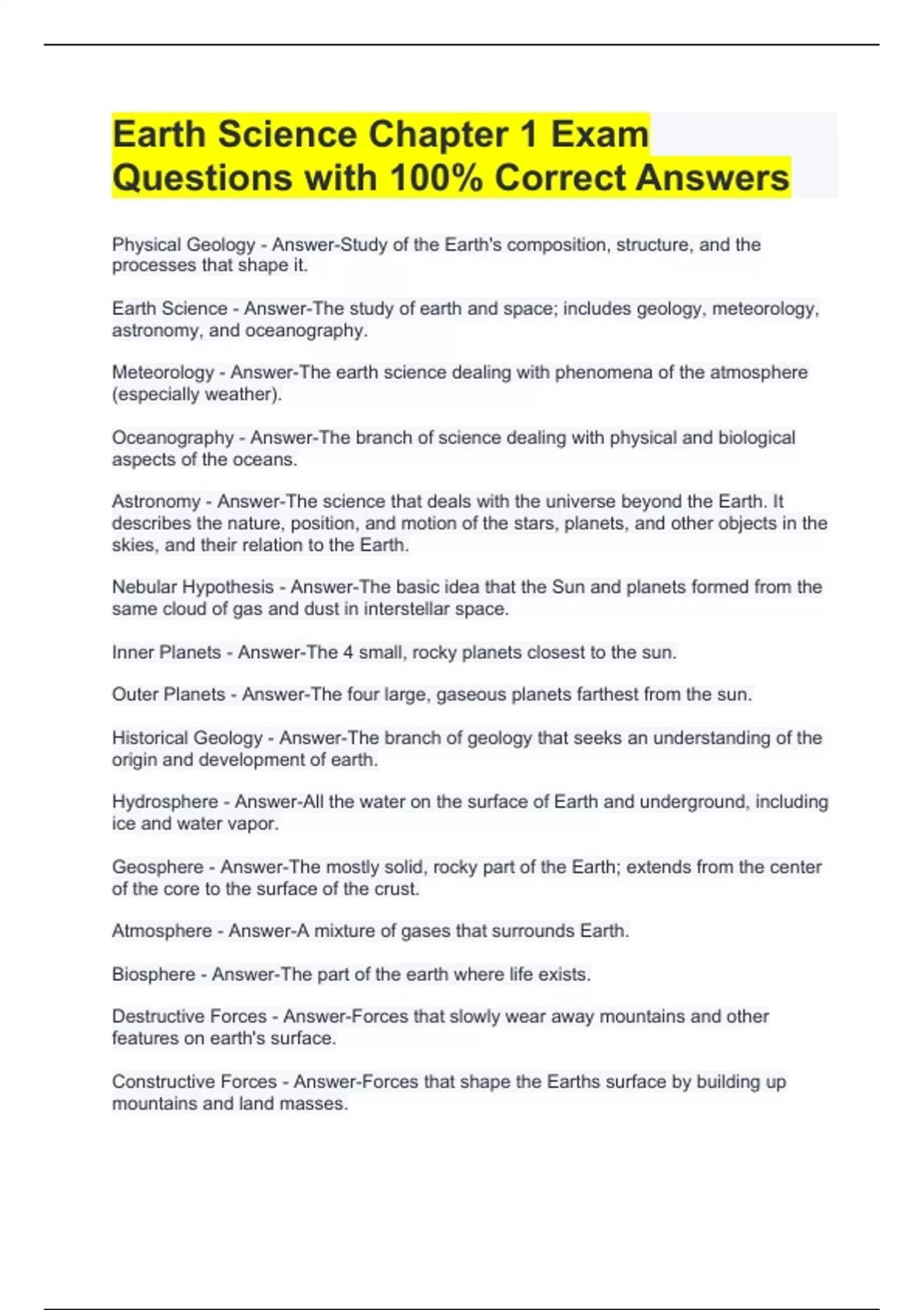 Earth Science Chapter 1 Exam Questions with 100% Correct Answers Physical Geology - Answer-Study of the Earth's composition, structure, and the processes that shape it. Earth Science - Answer-The study of earth and space; includes geology, meteorology, astronomy, and oceanography. Meteorology - Answer-The earth science dealing with phenomena of the atmosphere (especially weather). Oceanography - Answer-The branch of science dealing with physical and biological aspects of the oceans. Astronomy - Answer-The science that deals with the universe beyond the Earth. It describes the nature, position, and motion of the stars, planets, and other objects in the skies, and their relation to the Earth. Nebular Hypothesis - Answer-The basic idea that the Sun and planets formed from the same cloud of gas and dust in interstellar space. Inner Planets - Answer-The 4 small, rocky planets closest to the sun. Outer Planets - Answer-The four large, gaseous planets farthest from the sun. Historical Geology - Answer-The branch of geology that seeks an understanding of the origin and development of earth. Hydrosphere - Answer-All the water on the surface of Earth and underground, including ice and water vapor. Geosphere - Answer-The mostly solid, rocky part of the Earth; extends from the center of the core to the surface of the crust. Atmosphere - Answer-A mixture of gases that surrounds Earth. Biosphere - Answer-The part of the earth where life exists. Destructive Forces - Answer-Forces that slowly wear away mountains and other features on earth's surface. Constructive Forces - Answer-Forces that shape the Earths surface by building up mountains and land masses. Plate Tectonics - Answer-The theory that explains how large pieces of the lithosphere, called plates, move and change shape. Latitude - Answer-Distance north or south of the Equator, measured in degrees. Longitude - Answer-Distance east or west of the prime meridian, measured in degrees.