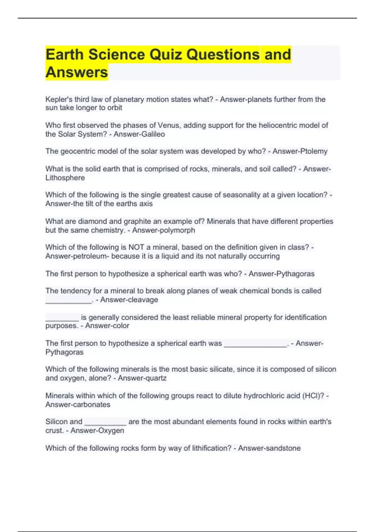 Earth Science Quiz Questions and Answers Kepler's third law of planetary motion states what? - Answer-planets further from the sun take longer to orbit Who first observed the phases of Venus, adding support for the heliocentric model of the Solar System? - Answer-Galileo The geocentric model of the solar system was developed by who? - Answer-Ptolemy What is the solid earth that is comprised of rocks, minerals, and soil called? - Answer-Lithosphere Which of the following is the single greatest cause of seasonality at a given location? - Answer-the tilt of the earths axis What are diamond and graphite an example of? Minerals that have different properties but the same chemistry. - Answer-polymorph Which of the following is NOT a mineral, based on the definition given in class? - Answer-petroleum- because it is a liquid and its not naturally occurring The first person to hypothesize a spherical earth was who? - Answer-Pythagoras The tendency for a mineral to break along planes of weak chemical bonds is called ___________. - Answer-cleavage ________ is generally considered the least reliable mineral property for identification purposes. - Answer-color The first person to hypothesize a spherical earth was _______________. - Answer-Pythagoras Which of the following minerals is the most basic silicate, since it is composed of silicon and oxygen, alone? - Answer-quartz Minerals within which of the following groups react to dilute hydrochloric acid (HCl)? - Answer-carbonates Silicon and __________ are the most abundant elements found in rocks within earth's crust. - Answer-Oxygen Which of the following rocks form by way of lithification? - Answer-sandstone