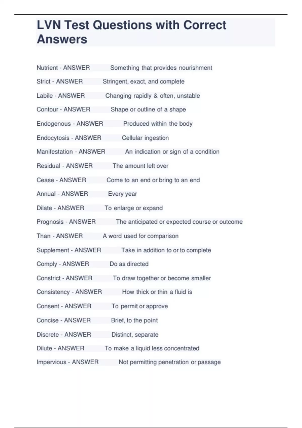 LVN Test Questions with Correct Answers Nutrient - ANSWER Something that provides nourishment Strict - ANSWER Stringent, exact, and complete Labile - ANSWER Changing rapidly & often, unstable Contour - ANSWER Shape or outline of a shape Endogenous - ANSWER Produced within the body Endocytosis - ANSWER Cellular ingestion Manifestation - ANSWER An indication or sign of a condition Residual - ANSWER The amount left over Cease - ANSWER Come to an end or bring to an end Annual - ANSWER Every year Dilate - ANSWER To enlarge or expand Prognosis - ANSWER The anticipated or expected course or outcome Than - ANSWER A word used for comparison Supplement - ANSWER Take in addition to or to complete Comply - ANSWER Do as directed Constrict - ANSWER To draw together or become smaller Consistency - ANSWER How thick or thin a fluid is Consent - ANSWER To permit or approve Concise - ANSWER Brief, to the point Discrete - ANSWER Distinct, separate Dilute - ANSWER To make a liquid less concentrated Impervious - ANSWER Not permitting penetration or passage