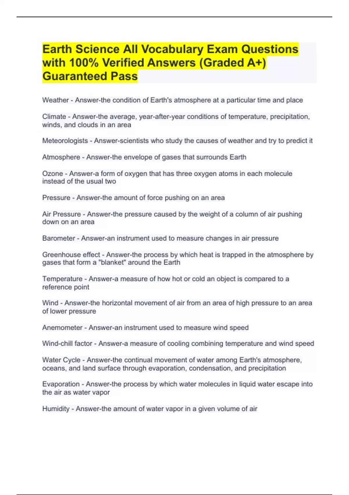 Earth Science All Vocabulary Exam Questions with 100% Verified Answers (Graded A+) Guaranteed Pass Weather - Answer-the condition of Earth's atmosphere at a particular time and place Climate - Answer-the average, year-after-year conditions of temperature, precipitation, winds, and clouds in an area Meteorologists - Answer-scientists who study the causes of weather and try to predict it Atmosphere - Answer-the envelope of gases that surrounds Earth Ozone - Answer-a form of oxygen that has three oxygen atoms in each molecule instead of the usual two Pressure - Answer-the amount of force pushing on an area Air Pressure - Answer-the pressure caused by the weight of a column of air pushing down on an area Barometer - Answer-an instrument used to measure changes in air pressure Greenhouse effect - Answer-the process by which heat is trapped in the atmosphere by gases that form a "blanket" around the Earth Temperature - Answer-a measure of how hot or cold an object is compared to a reference point Wind - Answer-the horizontal movement of air from an area of high pressure to an area of lower pressure Anemometer - Answer-an instrument used to measure wind speed Wind-chill factor - Answer-a measure of cooling combining temperature and wind speed Water Cycle - Answer-the continual movement of water among Earth's atmosphere, oceans, and land surface through evaporation, condensation, and precipitation Evaporation - Answer-the process by which water molecules in liquid water escape into the air as water vapor