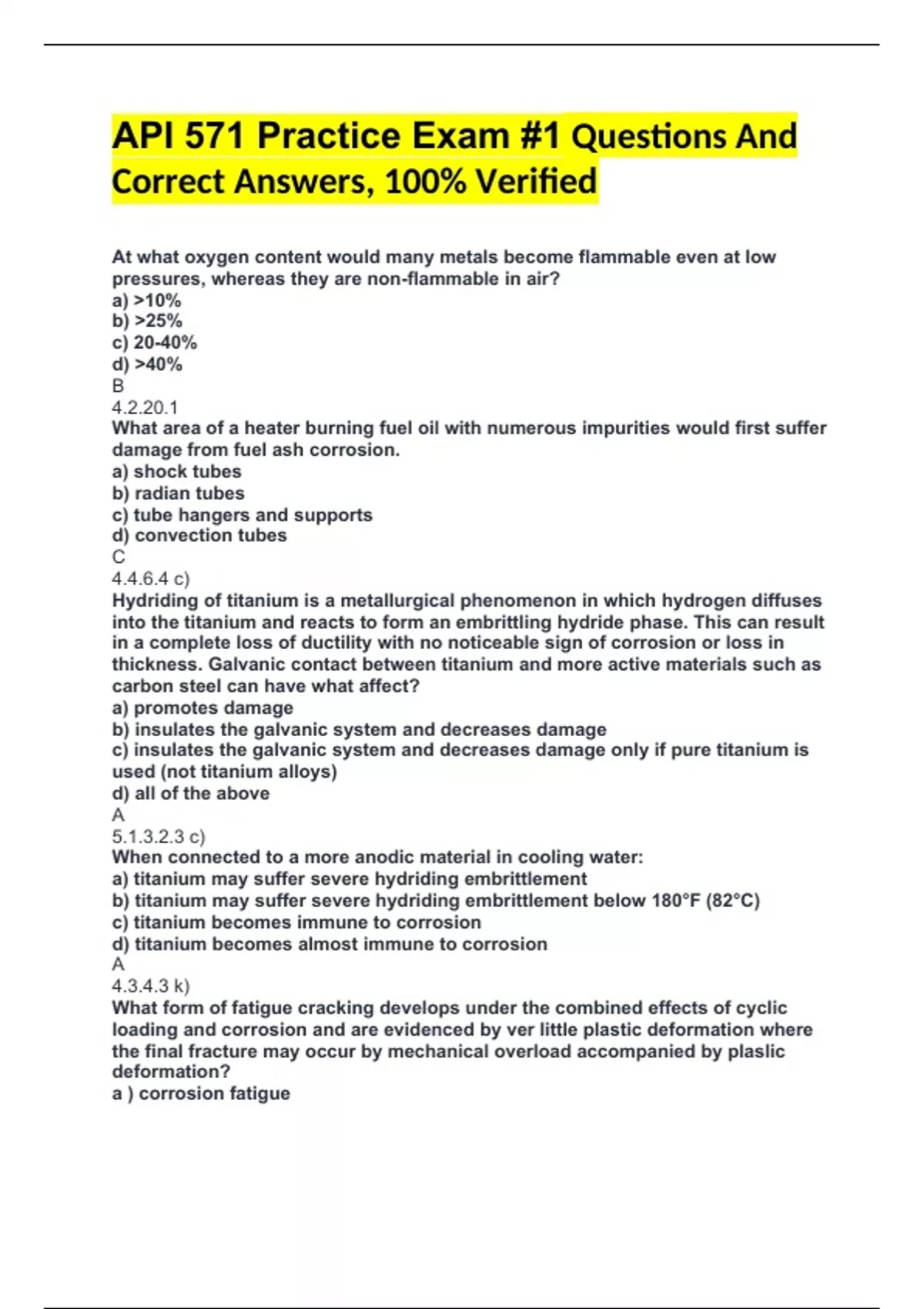 API 571 Practice Exam #1 Questions And Correct Answers, 100% Verified At what oxygen content would many metals become flammable even at low pressures, whereas they are non-flammable in air? a) 10% b) 25% c) 20-40% d) 40% B 4.2.20.1 What area of a heater burning fuel oil with numerous impurities would first suffer damage from fuel ash corrosion. a) shock tubes b) radian tubes c) tube hangers and supports d) convection tubes C 4.4.6.4 c) Hydriding of titanium is a metallurgical phenomenon in which hydrogen diffuses into the titanium and reacts to form an embrittling hydride phase. This can result in a complete loss of ductility with no noticeable sign of corrosion or loss in thickness. Galvanic contact between titanium and more active materials such as carbon steel can have what affect? a) promotes damage b) insulates the galvanic system and decreases damage c) insulates the galvanic system and decreases damage only if pure titanium is used (not titanium alloys) d) all of the above A 5.1.3.2.3 c) When connected to a more anodic material in cooling water: a) titanium may suffer severe hydriding embrittlement b) titanium may suffer severe hydriding embrittlement below 180°F (82°C) c) titanium becomes immune to corrosion d) titanium becomes almost immune to corrosion A 4.3.4.3 k) What form of fatigue cracking develops under the combined effects of cyclic loading and corrosion and are evidenced by ver little plastic deformation where the final fracture may occur by mechanical overload accompanied by plaslic deformation? a ) corrosion fatigue b) mechanical (vibration) fatigue c) thermal fatigue d) all ofthe a bove A 4.5.2.1 What could ammonium bisulfide corrosion also be called? a) fuel ash corrosion b) alkaline fuel ash corrosion c) alkaline sour water corrosion d) amine wa ter corrosion C 5.1.1.2 Typical HF alkylation units operate with 1% to 3% water in the acid, equivalent t o an HF-inwater concentration of 97% to 99% and the temperatures are gener ally below 150°F (66°C). Under these conditions wh at material is widely used for all equipment except where close tolerances are required for operation (i.e., pumps, valves, instruments)? a) carbon steel b) 300 series stainless steels c) duplex stainless steels d) nickel alloys A 5.1.1.6.3 e) Amine corrosion refers to the gener al and/or localized corrosion th at occurs principally on carbon steel in amine treating processes. Corrosion is not cau sed by the amine itself, but results from dissolved acid gases (COz and HzS), amine degr adation products, heat stable amine salts and other contaminants. Amine corrosion primarily occurs in which materials? a) carbon steel b) 300 series st ainless steels c) ferritic stainless st eels d) nickel alloys A 5.1.1.1.2 What is the most important factor related to mechanical fatigue of a piece of equipment? a) material selection b) equipment design c) operating conditions d) opera ting temper atures B 4.2.16.3 Temper embrittlement primarily occurs in: a) Some low alloy steels as a result oflong term exposure from 650oF to 1070oF b) All carbon and alloy steels as a result of long term exposure from 650oF to 1070oF c) All cast irons and all carbon steels above 800°F d) 2.25Cr-1Mo steels at 900oF D 4.2.3.2 a) Cracking of a metal due to stress relaxation during PWHT or in service at elevated temperatures is most often observed in heavy wall sections. This is called: a) stress relieving corrosion cr acking b) reheat cracking c) hydrogen induced stress relieving cracking d) SOHIC B 4.2.8.2 Creep can occur in: a) All metals and alloys. b) Only ferrous metals. c) Only in weldments of all metals and alloys. d) All carbon steels. A 4.2.8.2 Which combination of joined metals is most likely to corrode in an aggressive environment when a suitable electrolyte is present? a) steel-zinc b) steel-magnesium c) steel-aluminum d) titanium-zinc D Table 4-6 Visual examination of suspected n areas is only one means of inspect ion , others include: a) UT or RT to detect the extent of metal loss b) corrosion coupons and on-line corrosion monitoring electrical resistance probes c) IR scans to detect refractory loss on stream d) all of the above D 4.2.14.7 a) b) c) Naphthenic acid corrosion is suspected on a high velocity outlet line of a crude oil heater. What is the best method for inspecting for damage? a) spot UT thickness measurements b) RT followed by UT thickness measurement c) RT should be the primary detection method d) thermography B 5.1.1.7.7 a) Inspecting for vibration-induced fatigue may include: a) looking for visible signs of vibration, pipe movement or water hammer b) checking for the audible sounds of vibration emanating from piping components such as control valves and fittings c) conducting visual inspection during transient conditions (such as startups, shutdowns, upsets, etc.) for intermittent vibrating conditions d) all of the above D 4.2.17.7 Dissimilar metal welds with a 300 Series SS weld metal on a ferritic steel may result in: a) a narrow region of high hardness at the toe of the weld, near the fusion line on the ferritic steel side b) high hardness zones that render the material susceptible to various forms of environmental cracking such as sulfide stress cracking or hydrogen stress cracking c) high hardness zones that render the material susceptible to various forms of fatigue cracking, particularly hydrogen sulfide service d) a and b D 4.2.12.3 g) Hot refractory lined piping can be inspected and monitored by using: a) Hot-wall equipment on-stream using IR to monitor b) Cold-wall equipment on-stream using IR to monitor c) Visual examination during operation d) LP during shutdowns B 4.2.18.7 b) Which material has the most resistance to NAC in the following list? a) 316 SS b) 317 ss c) Alloy 625 d) 6% Mo Alloys C Table 5-2 A loss in toughness due to a metallurgical change that can occur in alloys containing a ferrite phase, as a result of exposure in the temperature range 600°F to 1000°F (316°C to 540