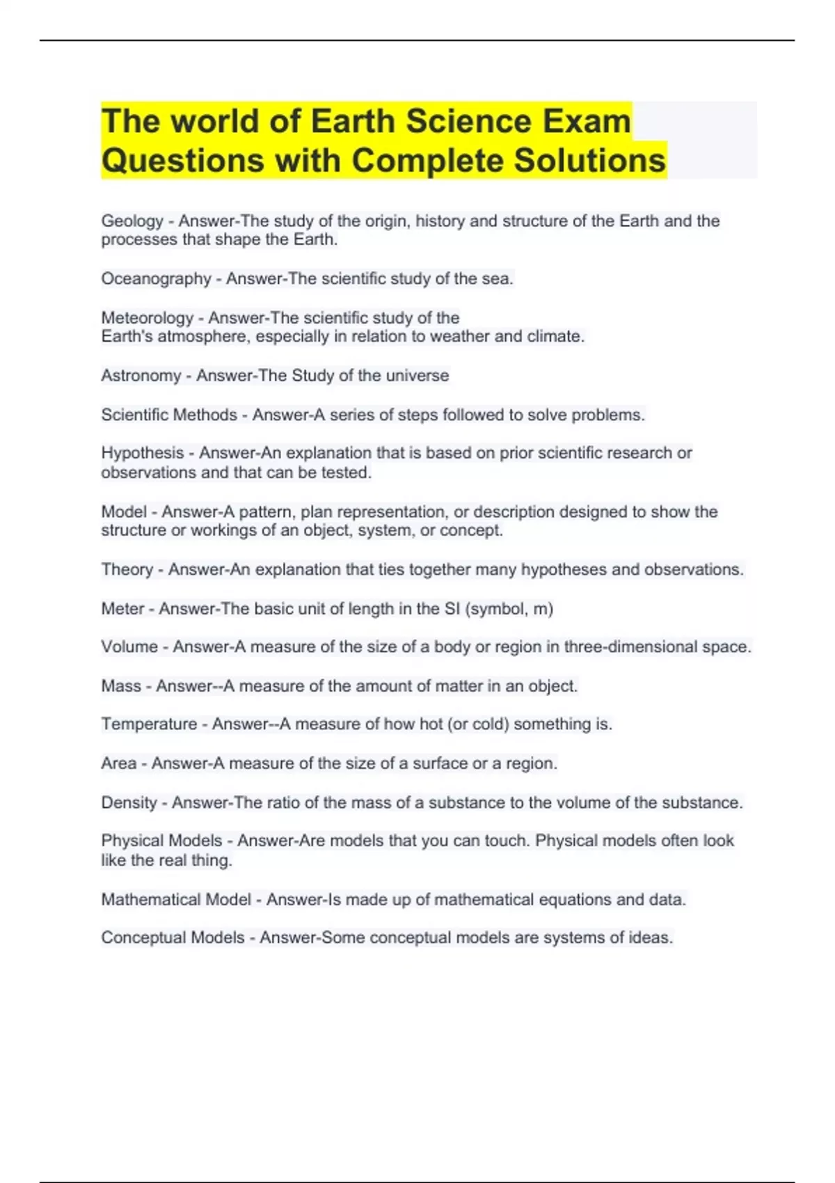 The world of Earth Science Exam Questions with Complete Solutions Geology - Answer-The study of the origin, history and structure of the Earth and the processes that shape the Earth. Oceanography - Answer-The scientific study of the sea. Meteorology - Answer-The scientific study of the Earth's atmosphere, especially in relation to weather and climate. Astronomy - Answer-The Study of the universe Scientific Methods - Answer-A series of steps followed to solve problems. Hypothesis - Answer-An explanation that is based on prior scientific research or observations and that can be tested. Model - Answer-A pattern, plan representation, or description designed to show the structure or workings of an object, system, or concept. Theory - Answer-An explanation that ties together many hypotheses and observations. Meter - Answer-The basic unit of length in the SI (symbol, m) Volume - Answer-A measure of the size of a body or region in three-dimensional space. Mass - Answer--A measure of the amount of matter in an object. Temperature - Answer--A measure of how hot (or cold) something is. Area - Answer-A measure of the size of a surface or a region. Density - Answer-The ratio of the mass of a substance to the volume of the substance. Physical Models - Answer-Are models that you can touch. Physical models often look like the real thing.