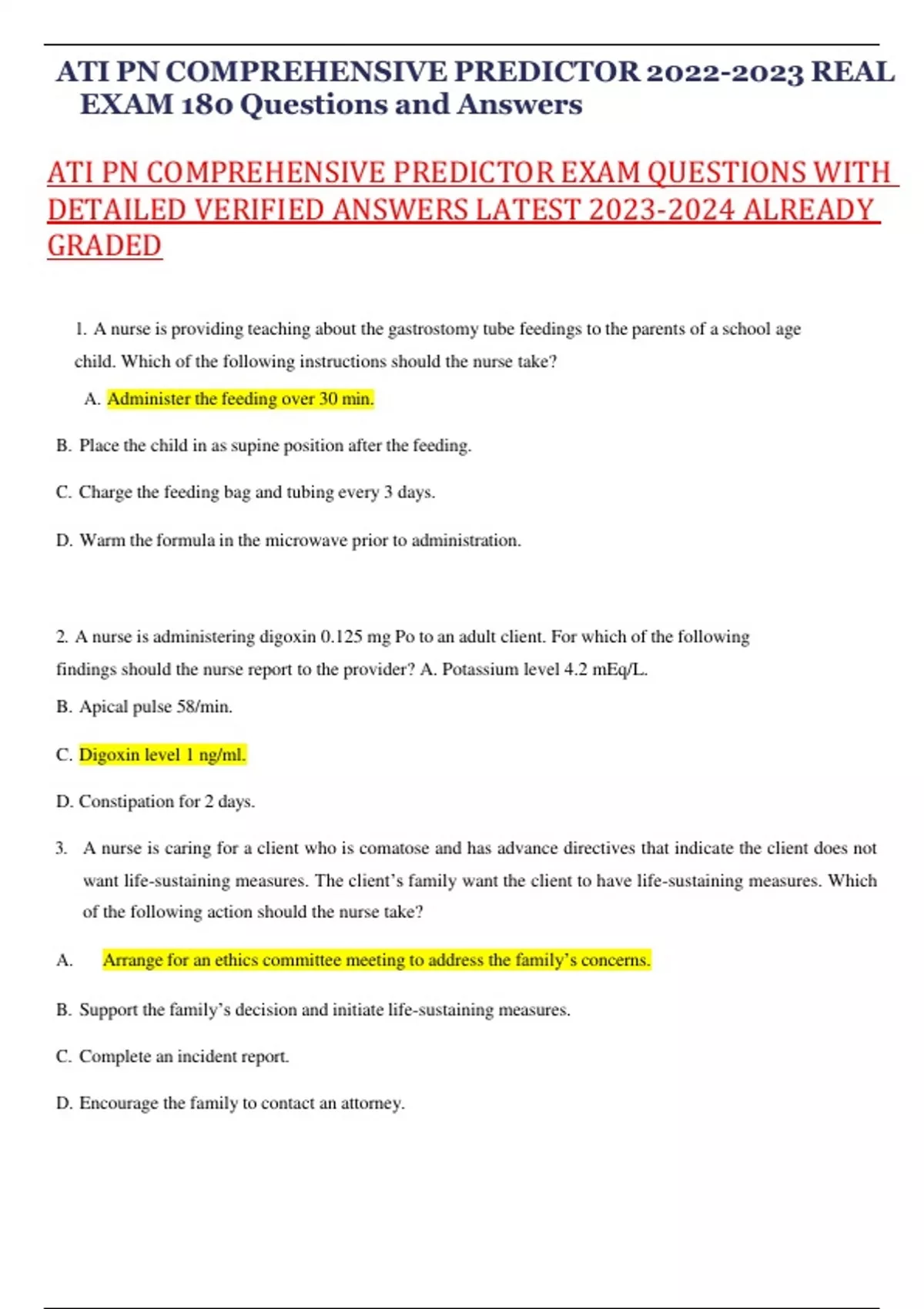 ATI PN COMPREHENSIVE PREDICTOR EXAM QUESTIONS WITH DETAILED VERIFIED ANSWERS LATEST ALREADY GRADED 1. A nurse is providing teaching about the gastrostomy tube feedings to the parents of a school age child. Which of the following instructions should the nurse take? A. Administer the feeding over 30 min. B. Place the child in as supine position after the feeding. C. Charge the feeding bag and tubing every 3 days. D. Warm the formula in the microwave prior to administration. 2. A nurse is administering digoxin 0.125 mg Po to an adult client. For which of the following findings should the nurse report to the provider? A. Potassium level 4.2 mEq/L. B. Apical pulse 58/min. C. Digoxin level 1 ng/ml. D. Constipation for 2 days. 3. A nurse is caring for a client who is comatose and has advance directives that indicate the client does not want life-sustaining measures. The client’s family want the client to have life-sustaining measures. Which of the following action should the nurse take? A. Arrange for an ethics committee meeting to address the family’s concerns. B. Support the family’s decision and initiate life-sustaining measures. C. Complete an incident report. D. Encourage the family to contact an attorney. ATI PN COMPREHENSIVE PREDICTOR REAL EXAM 180 Questions and Answers 4. A nurse is caring for a client who wears glasses. Which of the following actions should the nurse take? A. Store the glasses in a labele
