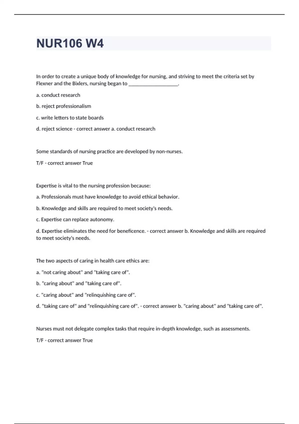 In order to create a unique body of knowledge for nursing, and striving to meet the criteria set by Flexner and the Bixlers, nursing began to __________________. a. conduct research b. reject professionalism c. write letters to state boards d. reject science - correct answer a. conduct research Some standards of nursing practice are developed by non-nurses. T/F - correct answer True Expertise is vital to the nursing profession because: a. Professionals must have knowledge to avoid ethical behavior. b. Knowledge and skills are required to meet society's needs. c. Expertise can replace autonomy. d. Expertise eliminates the need for beneficence. - correct answer b. Knowledge and skills are required to meet society's needs. The two aspects of caring in health care ethics are: a. "not caring about" and "taking care of". b. "caring about" and "taking care of". c. "caring about" and "relinquishing care of". d. "taking care of" and "relinquishing care of". - correct answer b. "caring about" and "taking care of". Nurses must not delegate complex tasks that require in-depth knowledge, such as assessments. T/F - correct answer True