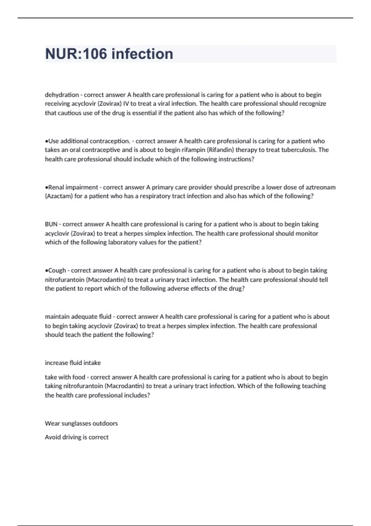 dehydration - correct answer A health care professional is caring for a patient who is about to begin receiving acyclovir (Zovirax) IV to treat a viral infection. The health care professional should recognize that cautious use of the drug is essential if the patient also has which of the following? •Use additional contraception. - correct answer A health care professional is caring for a patient who takes an oral contraceptive and is about to begin rifampin (Rifandin) therapy to treat tuberculosis. The health care professional should include which of the following instructions? •Renal impairment - correct answer A primary care provider should prescribe a lower dose of aztreonam (Azactam) for a patient who has a respiratory tract infection and also has which of the following? BUN - correct answer A health care professional is caring for a patient who is about to begin taking acyclovir (Zovirax) to treat a herpes simplex infection. The health care professional should monitor which of the following laboratory values for the patient? •Cough - correct answer A health care professional is caring for a patient who is about to begin taking nitrofurantoin (Macrodantin) to treat a urinary tract infection. The health care professional should tell the patient to report which of the following adverse effects of the drug? maintain adequate fluid - correct answer A health care professional is caring for a patient who is about to begin taking acyclovir (Zovirax) to treat a herpes simplex infection. The health care professional should teach the patient the following? increase fluid intake take with food - correct answer A health care professional is caring for a patient who is about to begin taking nitrofurantoin (Macrodantin) to treat a urinary tract infection. Which of the following teaching the health care professional includes?