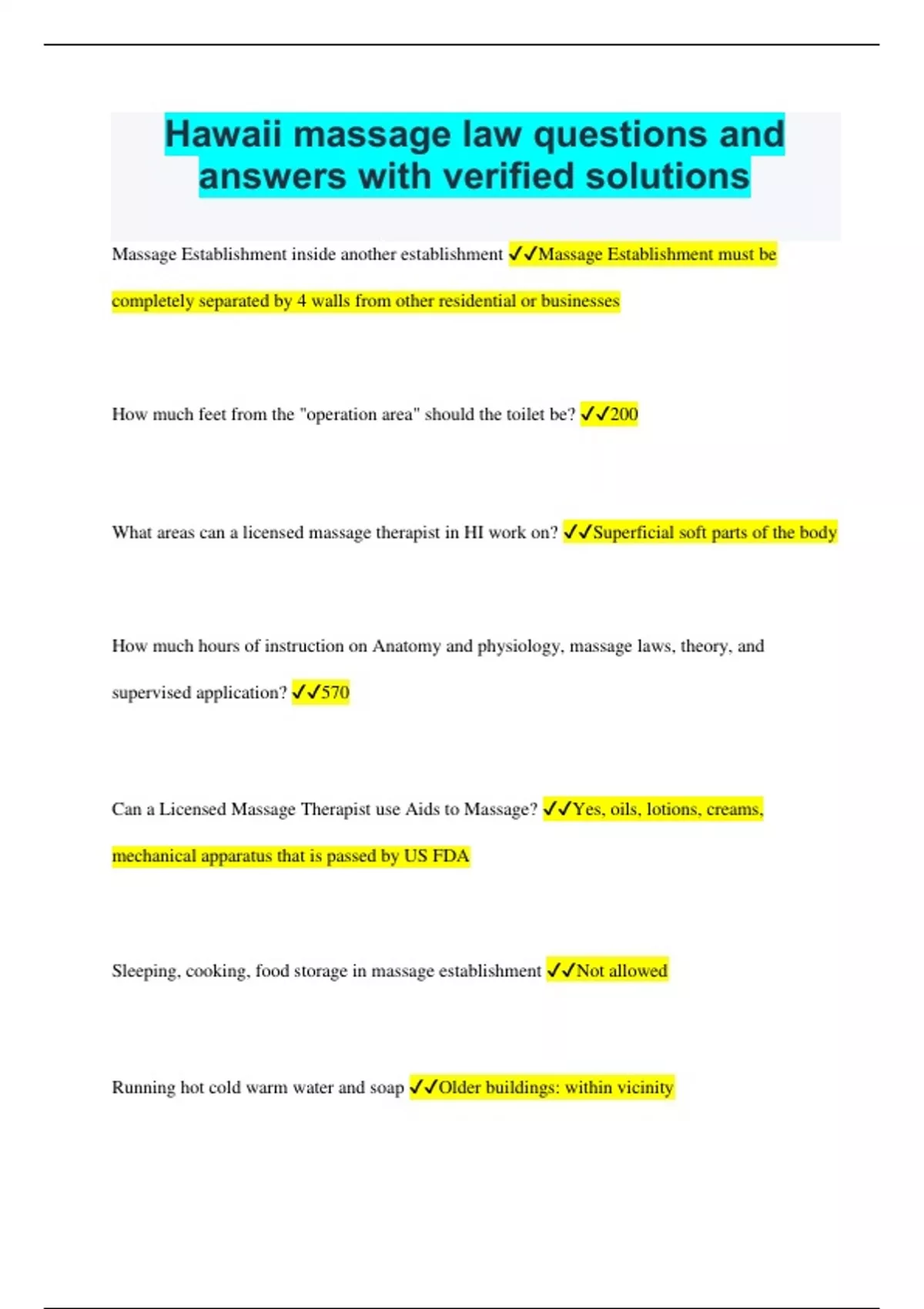 Hawaii massage law questions and answers with verified solutions