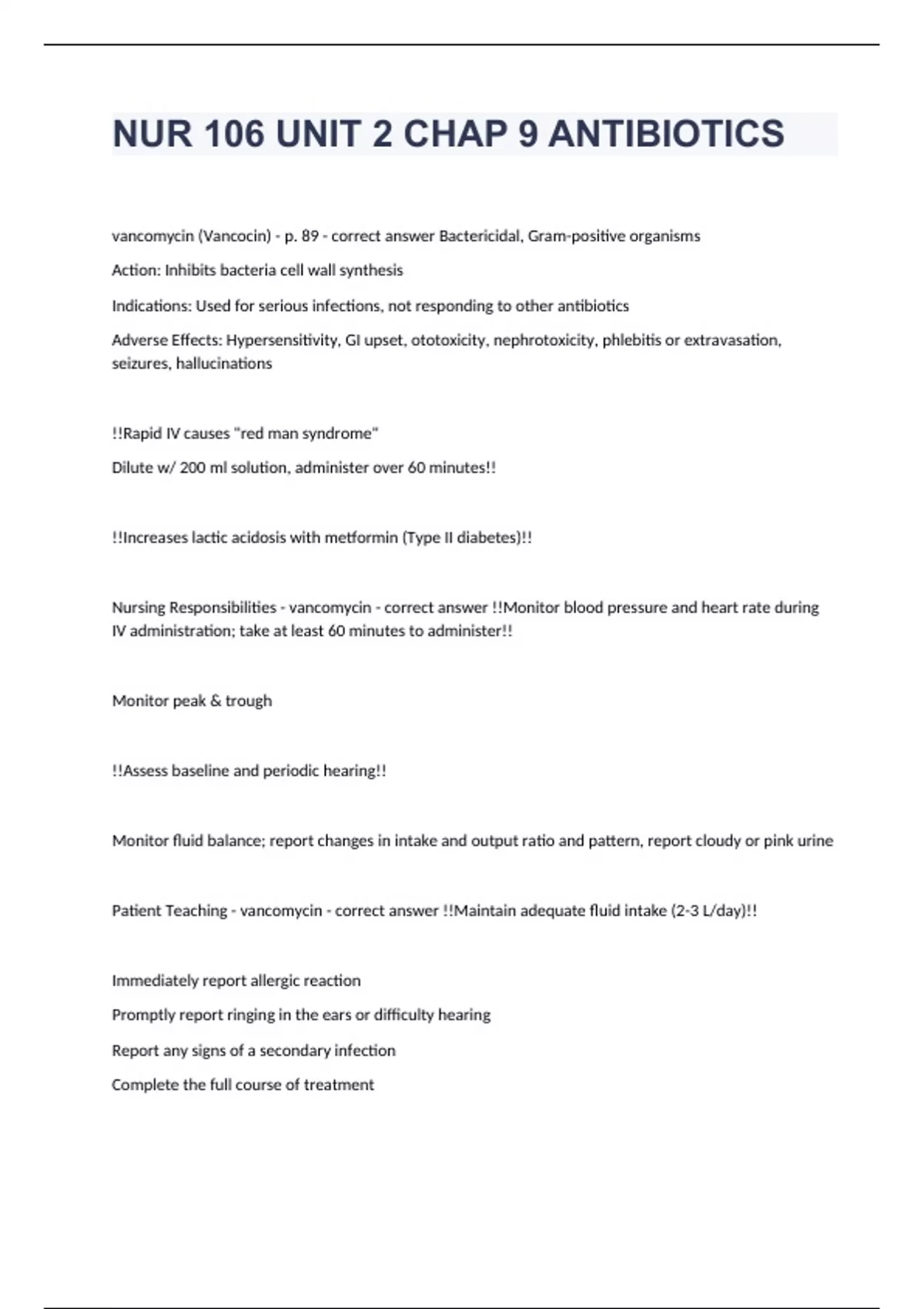 vancomycin (Vancocin) - p. 89 - correct answer Bactericidal, Gram-positive organisms Action: Inhibits bacteria cell wall synthesis Indications: Used for serious infections, not responding to other antibiotics Adverse Effects: Hypersensitivity, GI upset, ototoxicity, nephrotoxicity, phlebitis or extravasation, seizures, hallucinations !!Rapid IV causes "red man syndrome" Dilute w/ 200 ml solution, administer over 60 minutes!! !!Increases lactic acidosis with metformin (Type II diabetes)!! Nursing Responsibilities - vancomycin - correct answer !!Monitor blood pressure and heart rate during IV administration; take at least 60 minutes to administer!! Monitor peak & trough !!Assess baseline and periodic hearing!! Monitor fluid balance; report changes in intake and output ratio and pattern, report cloudy or pink urine Patient Teaching - vancomycin - correct answer !!Maintain adequate fluid intake (2-3 L/day)!! Immediately report allergic reaction Promptly report ringing in the ears or difficulty hearing Report any signs of a secondary infection