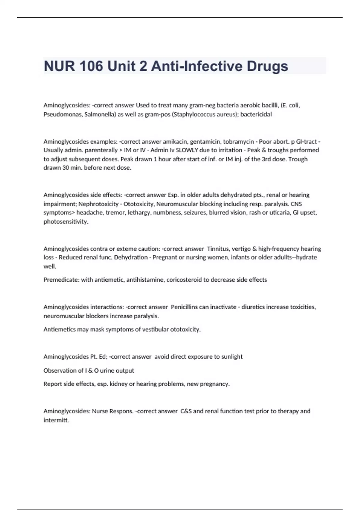 Aminoglycosides: -correct answer Used to treat many gram-neg bacteria aerobic bacilli, (E. coli, Pseudomonas, Salmonella) as well as gram-pos (Staphylococcus aureus); bactericidal Aminoglycosides examples: -correct answer amikacin, gentamicin, tobramycin - Poor abort. p GI-tract - Usually admin. parenterally > IM or IV - Admin Iv SLOWLY due to irritation - Peak & troughs performed to adjust subsequent doses. Peak drawn 1 hour after start of inf. or IM inj. of the 3rd dose. Trough drawn 30 min. before next dose. Aminoglycosides side effects: -correct answer Esp. in older adults dehydrated pts., renal or hearing impairment; Nephrotoxicity - Ototoxicity, Neuromuscular blocking including resp. paralysis. CNS symptoms> headache, tremor, lethargy, numbness, seizures, blurred vision, rash or uticaria, GI upset, photosensitivity. Aminoglycosides contra or exteme caution: -correct answer Tinnitus, vertigo & high-frequency hearing loss - Reduced renal func. Dehydration - Pregnant or nursing women, infants or older adullts--hydrate well. Premedicate: with antiemetic, antihistamine, coricosteroid to decrease side effects Aminoglycosides interactions: -correct answer Penicillins can inactivate - diuretics increase toxicities, neuromuscular blockers increase paralysis. Antiemetics may mask symptoms of vestibular ototoxicity. Aminoglycosides Pt. Ed; -correct answer avoid direct exposure to sunlight Observation of I & O urine output Report side effects, esp. kidney or hearing problems, new pregnancy.