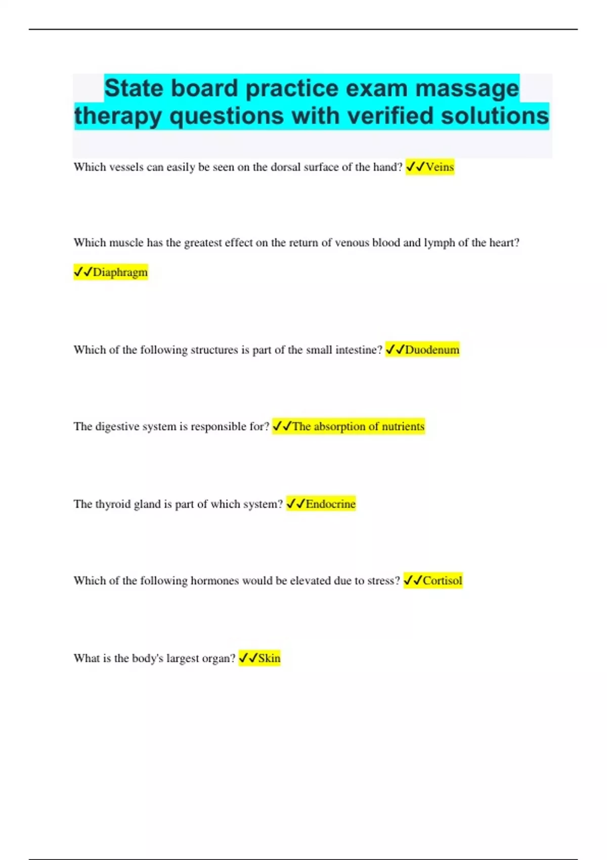 State board practice exam massage therapy questions with verified solutions Which vessels can easily be seen on the dorsal surface of the hand? Veins Which muscle has the greatest effect on the return of venous blood and lymph of the heart? Diaphragm Which of the following structures is part of the small intestine? Duodenum The digestive system is responsible for? The absorption of nutrients The thyroid gland is part of which system? Endocrine Which of the following hormones would be elevated due to stress? Cortisol What is the body's largest organ? Skin The primary function of the integumentary system is to? Provide protection Which bean shaped structures are found throughout the body with palpable groups found in the groin, axilla, neck? Lymph nodes The function of the spleen is to? Act as a site of lymphocyte maturation, blood filtration and storage Muscles are attached to bones by? Tendons Which of the following tissues contract to create movement in the body? Muscle Which of the following structures are composed of both sensory and motor fibers, allowing conduction in both directions? Mixed nerves Coughing, eye blinking and sneezing are examples of? Visceral reflexes Which of the following structures lines the thoracic walls and the thoracic surface of the diaphragm? Parietal pleura The exchange of gases is the main function of which of the following systems? Respiratory Which of the following landmarks is smooth rounded and located at the articular ends of bones? Condyle Which type of joint allows the most range of motion? Diarthrotic Rods and cones are examples of which type of receptor? Photoreceptors The function of the cochlear nerv