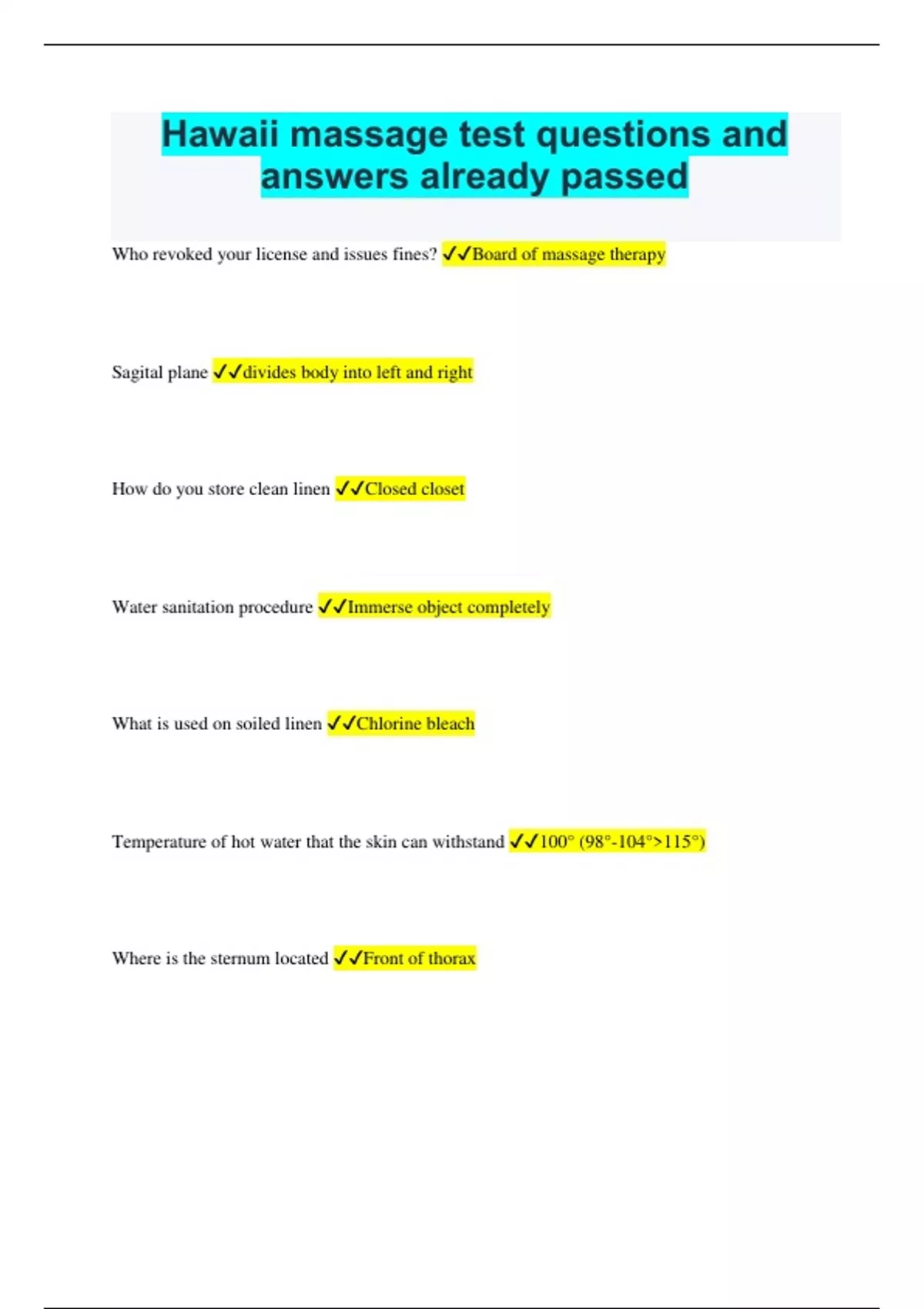 Hawaii massage test questions and answers already passed