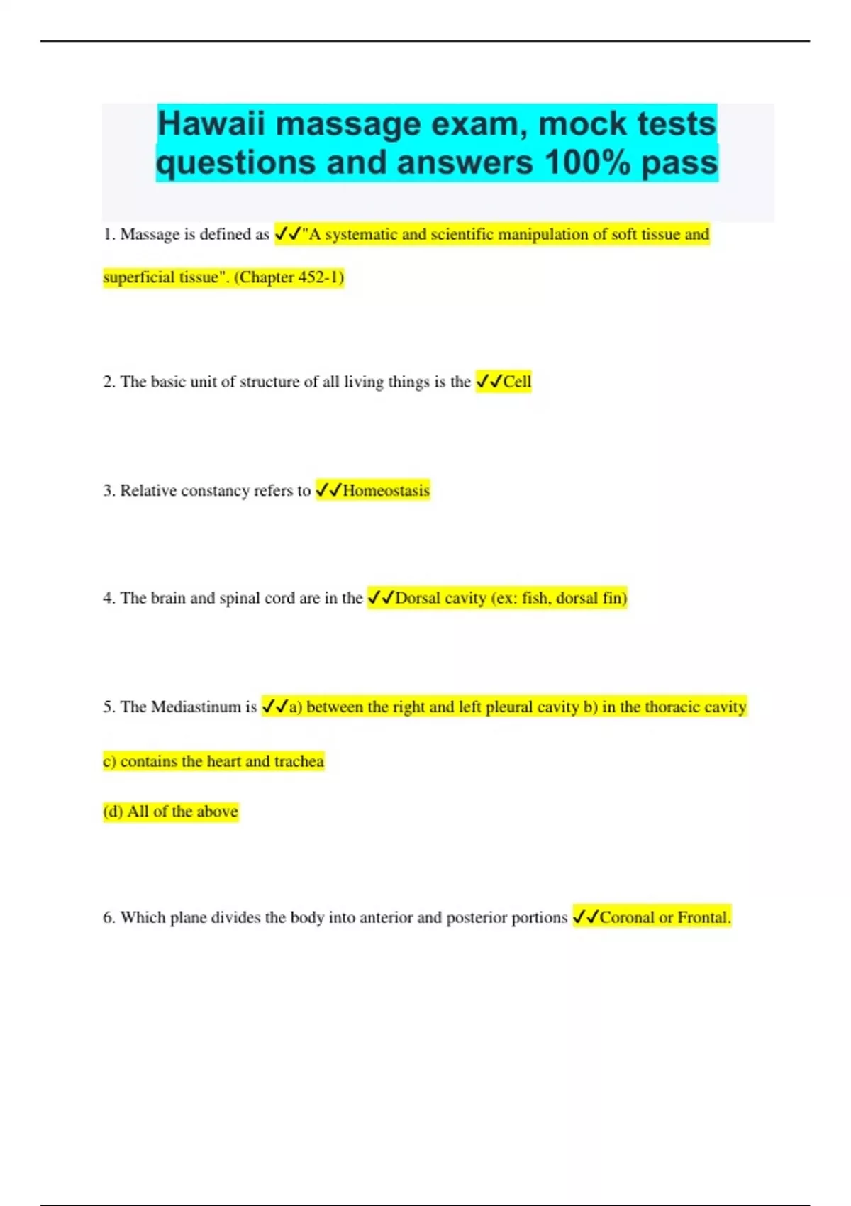 Hawaii massage exam, mock tests questions and answers 100% pass 1. Massage is defined as "A systematic and scientific manipulation of soft tissue and superficial tissue". (Chapter 452-1) 2. The basic unit of structure of all living things is the Cell 3. Relative constancy refers to Homeostasis 4. The brain and spinal cord are in the Dorsal cavity (ex: fish, dorsal fin) 5. The Mediastinum is a) between the right and left pleural cavity b) in the thoracic cavity c) contains the heart and trachea (d) All of the above 6. Which plane divides the body into anterior and posterior portions Coronal or Frontal. 7. What burn classification do blisters form 2nd degree 8. Which are not functions of the skeletal system Posture 9. The primary functions of the muscles are Heat, movement, posture 10. Abduction is Away from the midline of the body 11. Glands that secrete their products into the ducts are called _____________glands. Exocrine 12. Glands that secrete their products into the bloodstream are Endocrine 13. The primary function of the red blood cells is Transport of gases 14. Blood is composed of Plasma, RBCs, WBCs, platelets 15. The universal blood donor is "O" whereas the universal recipient is "AB". 16. The two systems responsible for gas exchange are Respiratory and cardiovascular 17. The structure where the gas exchange takes place is the Alveolus (located in the lung) 18. The sequential order for passage of air expiration is Bronchi, trachea, larynx, pharynx 19. Carbohydrate digestion is accomplished by the following enzymes a) amylase b) maltase c) sucrase (d) ALL OF THE ABOVE 20. The functional unit of the kidney is Nephron 21. The term that describes the reclining (face up) position is Supine 22. The humerus articulates with the Ulna 23. The four types of tissue are CMEN- connective, muscle, epithelial, nervous 24. Anatomy is The study of the structure of all living things 25. The anatomical position is Body erect, arms at side, palms forward 26. A sagittal plane Divides the body between right and left (Coronal/frontal = anterior and posterior, Transverse = upper and lower) 27. The body's most important function is Survival 28. What separates the Thoracic and Abdominopelvic