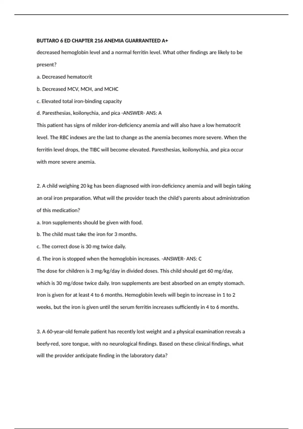 2. A child weighing 20 kg has been diagnosed with iron-deficiency anemia and will begin taking an oral iron preparation. What will the provider teach the child's parents about administration of this medication? a. Iron supplements should be given with food. b. The child must take the iron for 3 months. c. The correct dose is 30 mg twice daily. d. The iron is stopped when the hemoglobin increases. -ANSWER- ANS: C The dose for children is 3 mg/kg/day in divided doses. This child should get 60 mg/day, which is 30 mg/dose twice daily. Iron supplements are best absorbed on an empty stomach. Iron is given for at least 4 to 6 months. Hemoglobin levels will begin to increase in 1 to 2 weeks, but the iron is given until the serum ferritin increases sufficiently in 4 to 6 months. 3. A 60-year-old female patient has recently lost weight and a physical examination reveals a beefy-red, sore tongue, with no neurological findings. Based on these clinical findings, what will the provider anticipate finding in the laboratory data? a. Decreased homocysteine levels b. Leukopenia and thrombocytopenia c. Low hemoglobin and elevated MCV d. Normal methylmalonic acid level -ANSWER- ANS: C Macrocytic anemia caused by vitamin B12 deficiency will have symptoms described above. Although folate acid deficiency causes macrocytic anemia, there are rarely any symptoms. Hemoglobin will be decreased and MCV will increase. Homocysteine levels will be increased. The patient with B12 deficiency will have leukopenia and thrombocytopenia with severe deficiency, characterized by neurologic findings, which this patient does not have. Methylmalonic acid level will decrease.