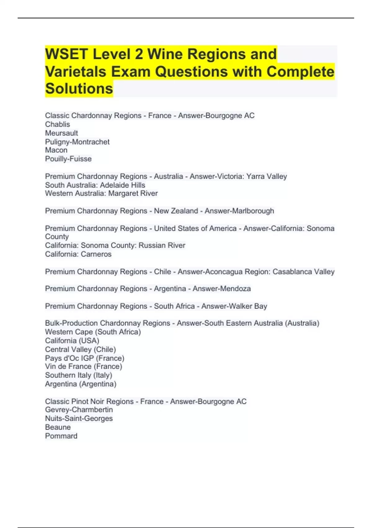 WSET Level 2 Wine Regions and Varietals Exam Questions with Complete Solutions Classic Chardonnay Regions - France - Answer-Bourgogne AC Chablis Meursault Puligny-Montrachet Macon Pouilly-Fuisse Premium Chardonnay Regions - Australia - Answer-Victoria: Yarra Valley South Australia: Adelaide Hills Western Australia: Margaret River Premium Chardonnay Regions - New Zealand - Answer-Marlborough Premium Chardonnay Regions - United States of America - Answer-California: Sonoma County California: Sonoma County: Russian River California: Carneros Premium Chardonnay Regions - Chile - Answer-Aconcagua Region: Casablanca Valley Premium Chardonnay Regions - Argentina - Answer-Mendoza Premium Chardonnay Regions - South Africa - Answer-Walker Bay Bulk-Production Chardonnay Regions - Answer-South Eastern Australia (Australia) Western Cape (South Africa) California (USA) Central Valley (Chile) Pays d'Oc IGP (France) Vin de France (France) Southern Italy (Italy) Argentina (Argentina) Classic Pinot Noir Regions - France - Answer-Bourgogne AC Gevrey-Charmbertin Nuits-Saint-Georges Beaune Pommard
