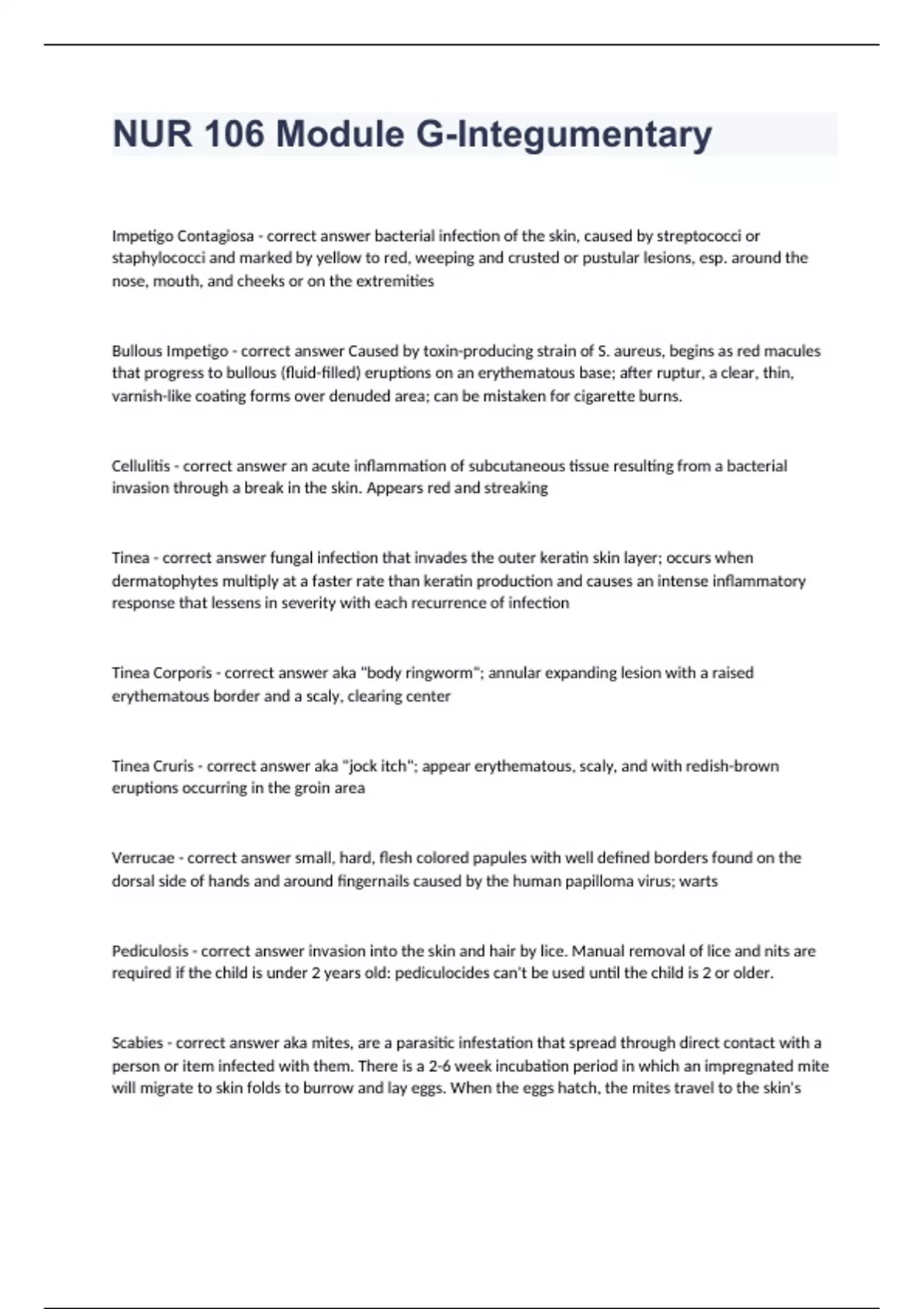 Impetigo Contagiosa - correct answer bacterial infection of the skin, caused by streptococci or staphylococci and marked by yellow to red, weeping and crusted or pustular lesions, esp. around the nose, mouth, and cheeks or on the extremities Bullous Impetigo - correct answer Caused by toxin-producing strain of S. aureus, begins as red macules that progress to bullous (fluid-filled) eruptions on an erythematous base; after ruptur, a clear, thin, varnish-like coating forms over denuded area; can be mistaken for cigarette burns. Cellulitis - correct answer an acute inflammation of subcutaneous tissue resulting from a bacterial invasion through a break in the skin. Appears red and streaking Tinea - correct answer fungal infection that invades the outer keratin skin layer; occurs when dermatophytes multiply at a faster rate than keratin production and causes an intense inflammatory response that lessens in severity with each recurrence of infection Tinea Corporis - correct answer aka "body ringworm"; annular expanding lesion with a raised erythematous border and a scaly, clearing center Tinea Cruris - correct answer aka "jock itch"; appear erythematous, scaly, and with redish-brown eruptions occurring in the groin area Verrucae - correct answer small, hard, flesh colored papules with well defined borders found on the dorsal side of hands and around fingernails caused by the human papilloma virus; warts Pediculosis - correct answer invasion into the skin and hair by lice. Manual removal of lice and nits are required if the child is under 2 years old: pediculocides can't be used until the child is 2 or older. Scabies - correct answer aka mites, are a parasitic infestation that spread through direct contact with a person or item infected with them. There is a 2-6 week incubation period in which an impregnated mite